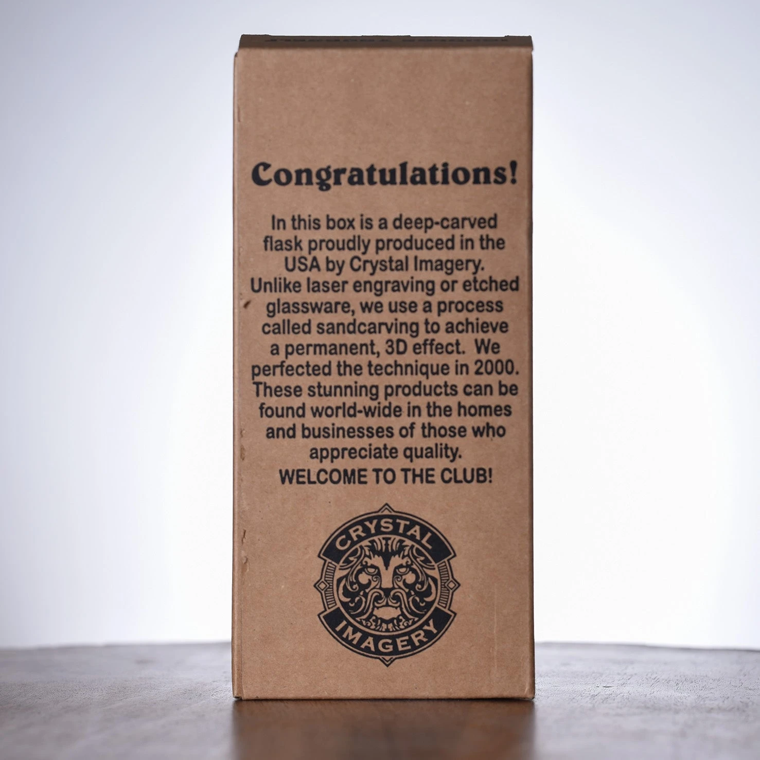 Each personalized glass flask measures 8″H x 3 3/4″W x 1 1/2″H, and holds 8.5 ounces. Each of our flasks will arrive beautifully gift boxed for jaw-dropping presentation to your gift recipient.