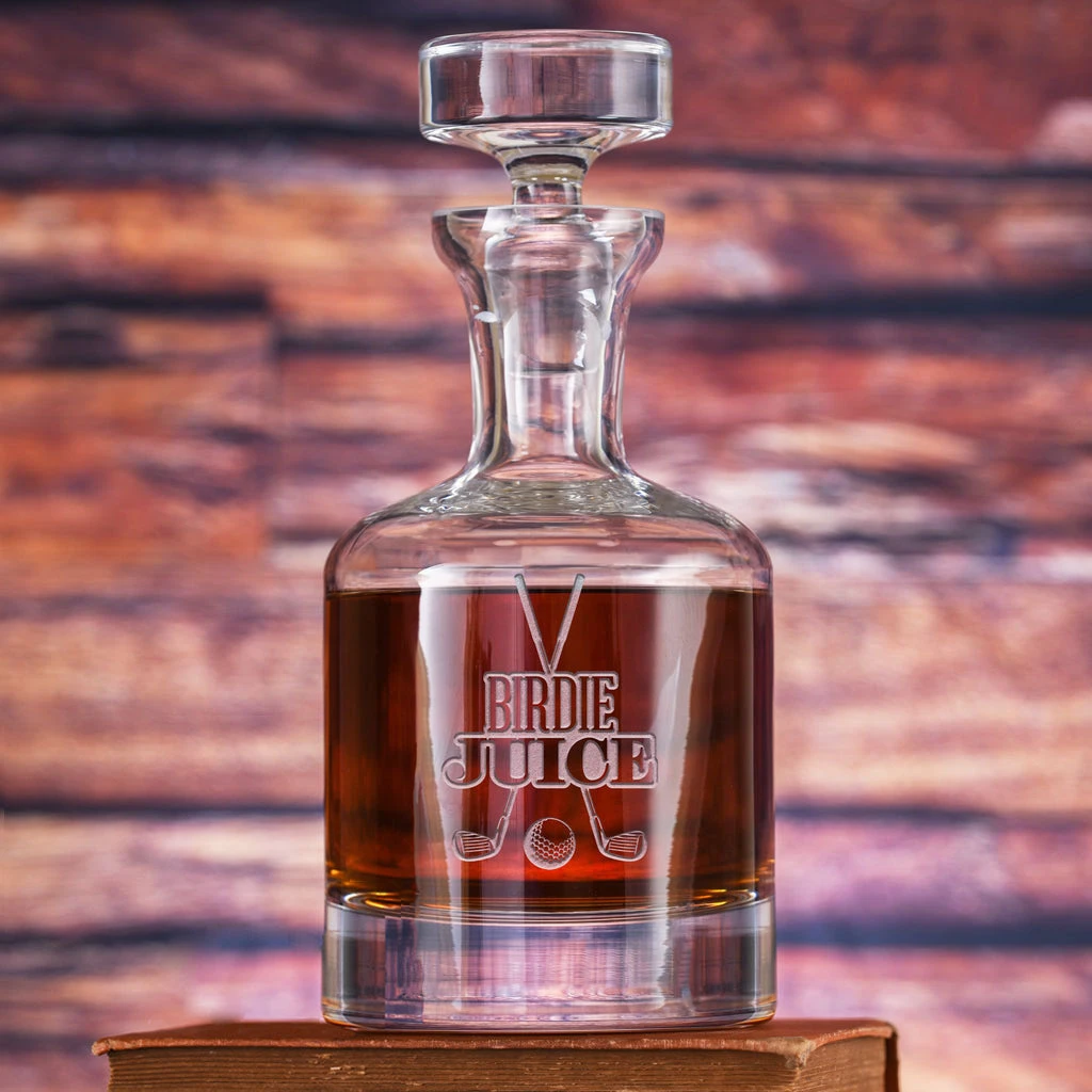 Birdie Juice Golf Theme Engraved Crystal Decanter features a beautifully, deep etched golf ball and golf clubs design and is the best gift for a golf lover whether a pro or beginner. This gorgeous gift for a golf player is meticulously hand carved by our master carvers and trained artisans to create a stunning 3D finish on your scotch decanter that is unmatched by simple surface engraving or etching.