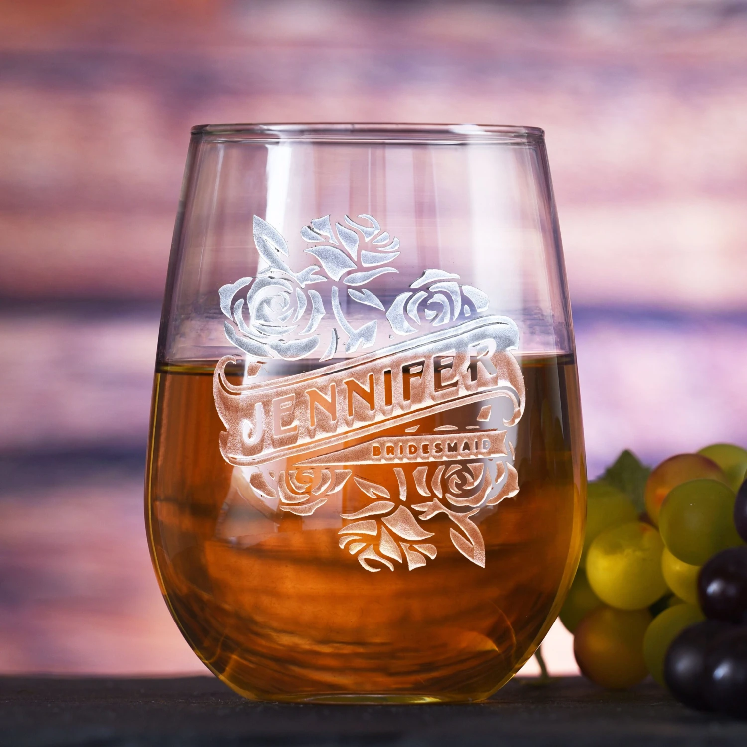 Bridal party gifts should show your wedding party attendants just how much you appreciate them. Our engraved wedding stemless wine glasses are made by a unique sand-carving method that leaves a 3D effect that makes jaws drop! Engraved glasses and etched glasses can’t touch the high quality of our custom designed bridal party wine glasses, making them a unique wedding attendant gift that is unmatched in quality. Your bridesmaids and maid of honor will use their custom wine glass for many years. Personalized with both the name and title of each attendant, each bridesmaid has a custom gift to cherish.Each bridal party stemless glass features a stunning floral design with the attendant’s name and title boldly displayed in a scrolling banner. At 4.75″ high by 4″ wide, our custom stemless wine glass holds 16 oz of your favorite wine in style. Dishwasher safe. Made in the USA. Price per item will lower in your cart as each item is added to the cart.