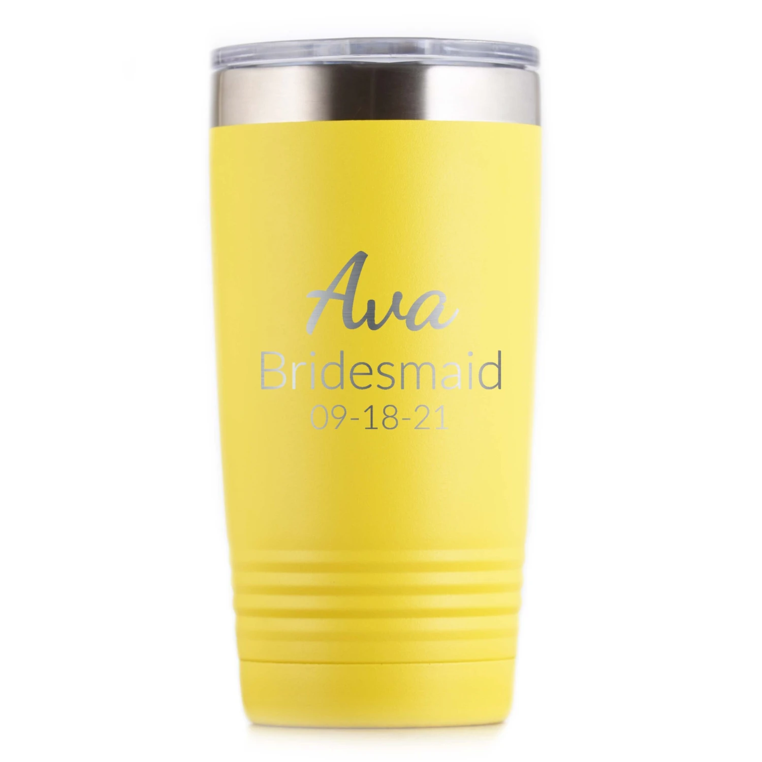 Bridesmaid Custom Travel Tumbler Gift. Great bridal party or bachelorette party gift for your bridesmaids and maid of honor. Custom engraved with your name and wedding date. Our travel tumbler is perfect for hot coffee or cold beverages on the run and has a narrower bottom to fit most cup holders in your car, jeep or truck. The opening in the lid is also big enough for a straw! We selected these Polar Camel 20 oz. ring neck vacuum insulated travel mugs for their high quality and durability. We laser etch our unique, funny and clever quotes and designs into the powder coated travel tumbler, which creates the design in a sleek stainless steel finish.