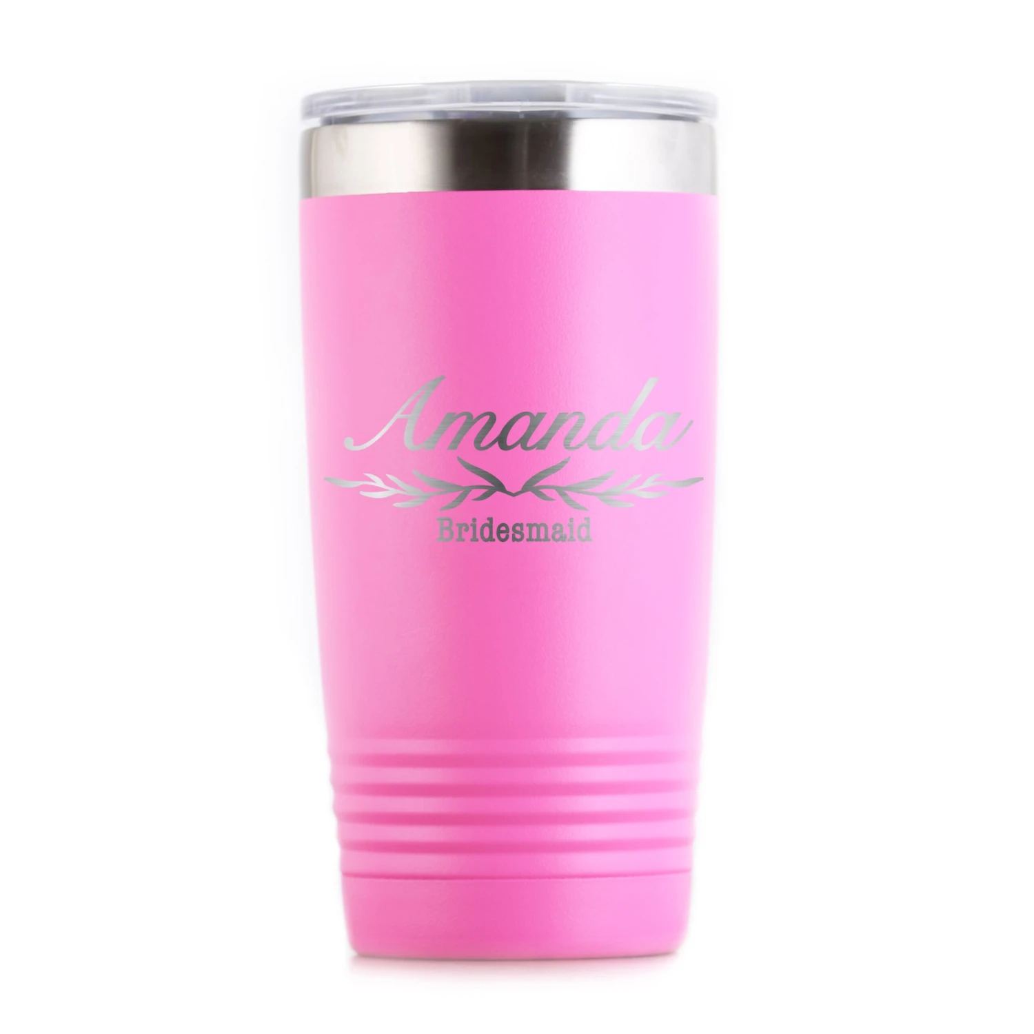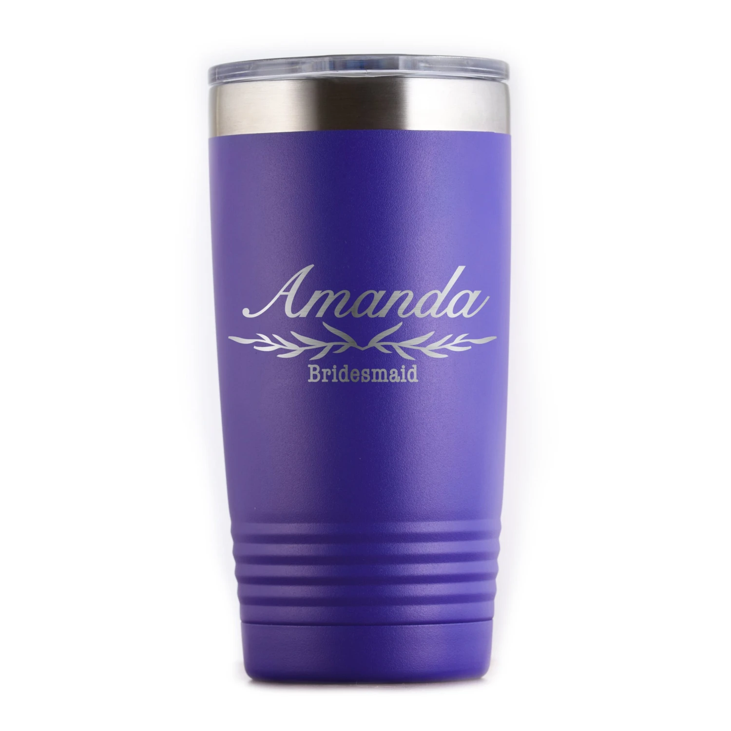 Bridesmaid and Maid of Honor Travel Tumbler Gift. Our bridal party insulated tumbler for the wedding day, bridesmaid proposal or bachelorette party is a custom gift for those who will stand by you on your wedding day. Custom engraved with bride and groom initials and wedding date. Your guests will use these tumblers for coffee, iced beverages and cocktails for years to come.
