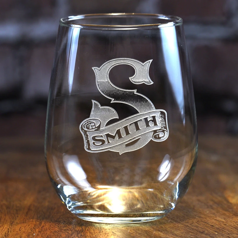 A cool new engraved and personalized Stemless Wine Glass Gift Set from Crystal Imagery. This design is both unique and timeless. We combined an awesome font with an overlay banner creating a visually appealing personalized design. And as always, the design is deep carved into the wine glass to give you the heirloom quality you’ve come to expect from Crystal Imagery!