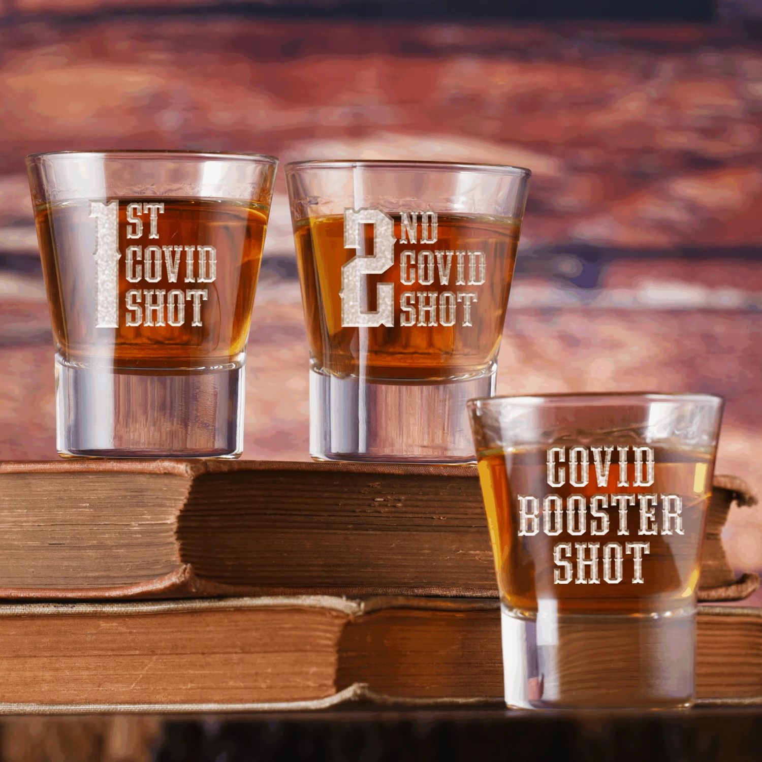 1st Covid Shot, 2nd Covid Shot and Booster Shot barware gift set of 3 is a fun-loving way to endure the current times we are all facing. First and second Covid-19 shot glasses are deeply etched or engraved using our unique sand-carving method to create a deep relief, 3D finish that is unmatched by the laser engraving competition.