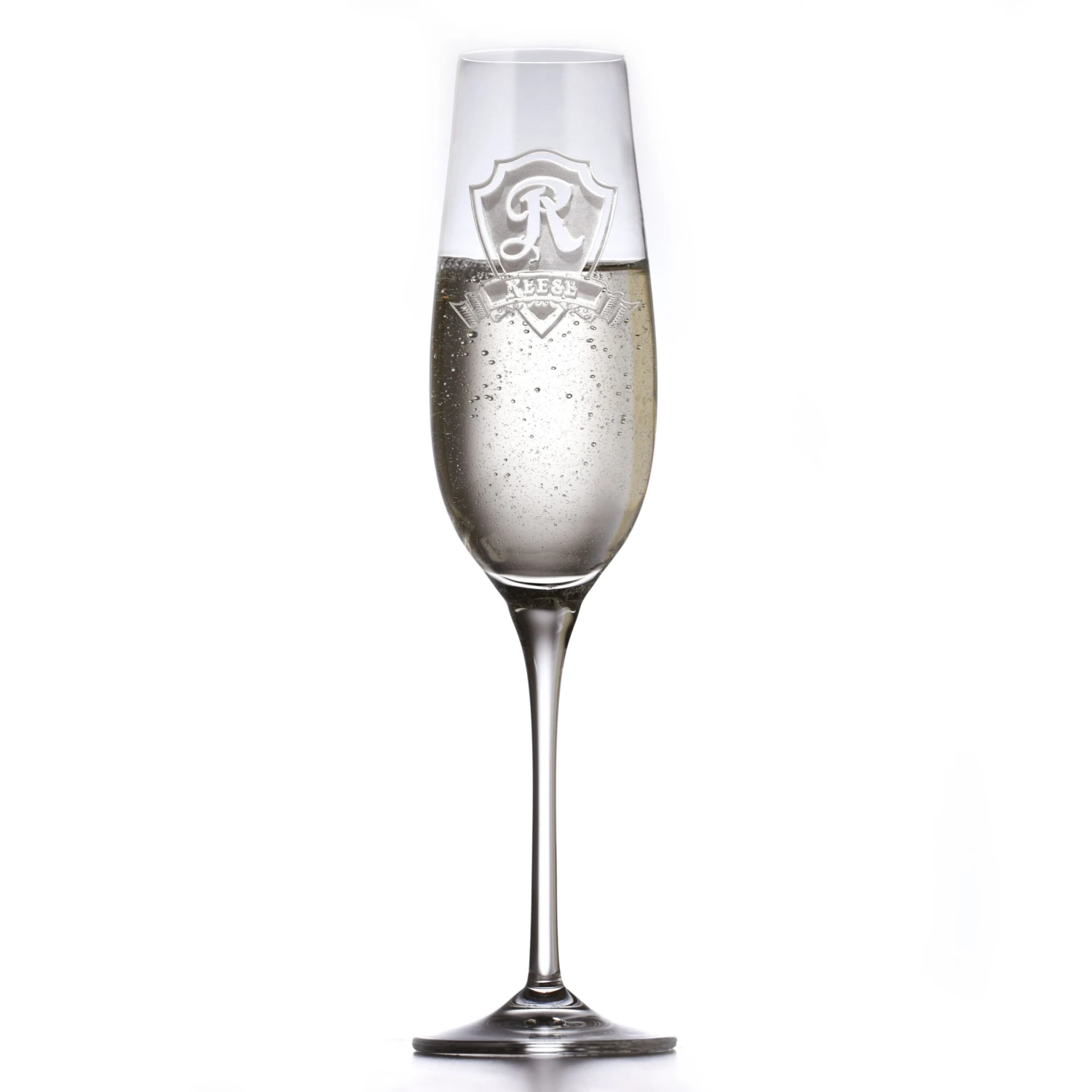 Crystal Imagery’s custom engraved Ravenscroft Crystal champagne glasses are a cool and unique personalized gift for men and women who love their prosecco and mimosas. A gift for him or her, your loved ones will love the deeply carved shield featuring their monogram with a cool name banner to showcase your first or last name of choice. Featuring a pulled stem and sheer rim, this durable, lead-free crystal champagne toasting flute by Ravenscroft is dishwasher safe, however we recommend hand washing. Measures 9.5″ high and holds 7 ounces of your favorite champagne, Prosecco, mimosas, and more.