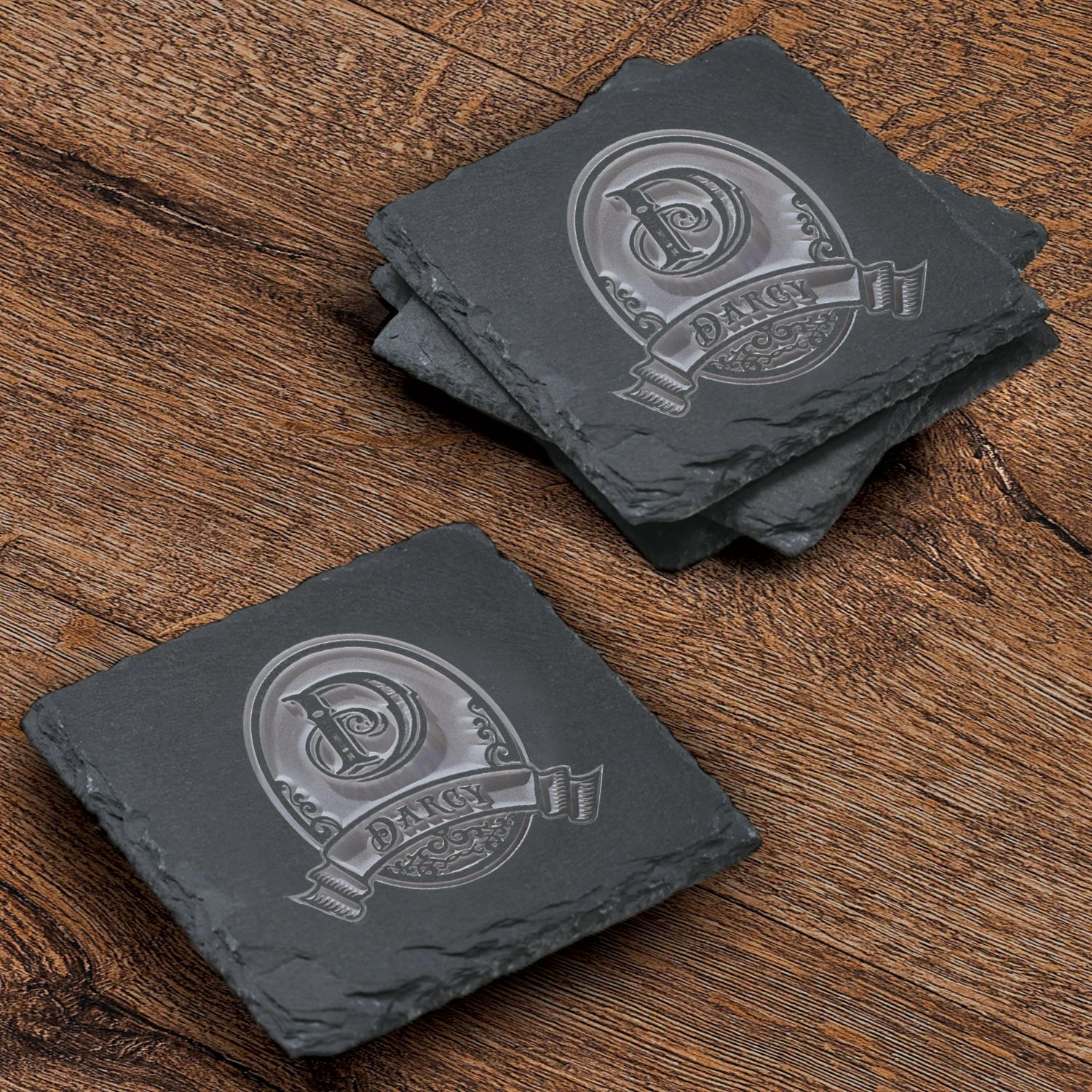 Sold as a set of 4 slate coasters which features your monogram initial in an intricately carved oval panel and your full name proudly engraved into a regal banner across the bottom.