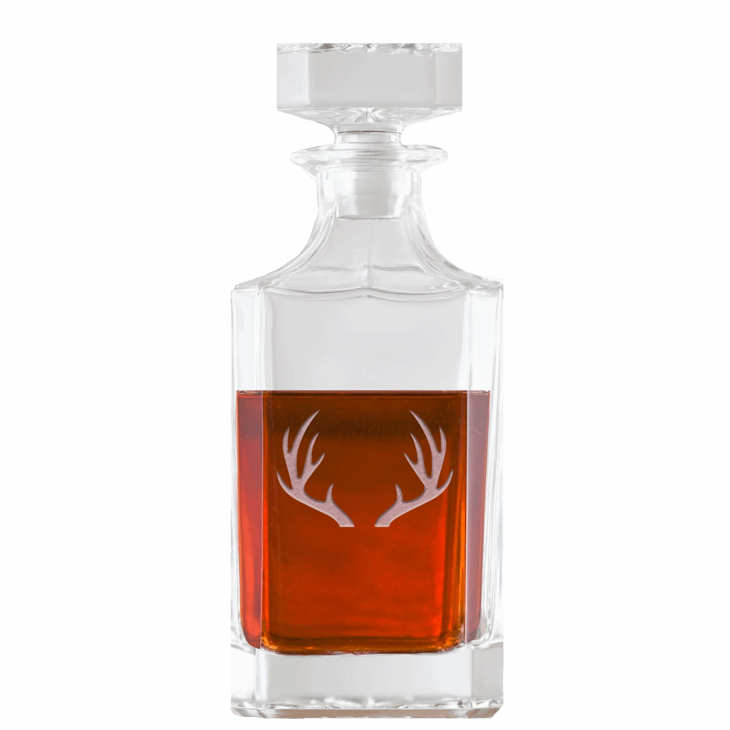 Custom engraved square whiskey decanter gift featuring deer or elk antlers is deep etched making it a cool birthday, Christmas, wedding, or anniversary gift for the bride and groom and men or women. Show him or her your love and appreciation with this cool antler design deeply engraved into a heavy-weight high-quality scotch, bourbon, or whiskey decanter. Our deep-carved custom deer or elk whiskey decanter is a perfect custom-etched gift that will be cherished for years to come. Our master carvers will deeply sand carve the background design into the glass, leaving your lettering and design raised from the glass surface in a stunning 3D manner that is unmatched by simple engraving, etching, or screenprinting techniques. At 8.5″ high, our custom deer or elk decanter with logo holds 26 oz of your favorite spirit.