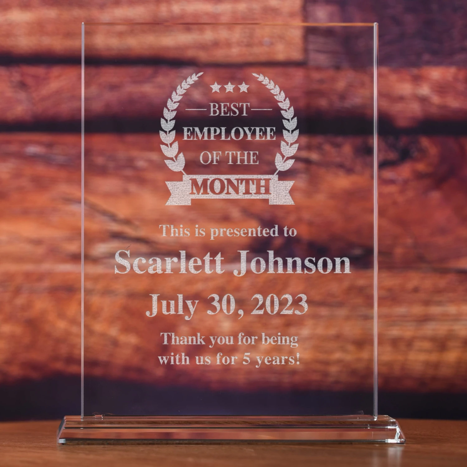 Employee of the Month recognition award is beautifully deep etched into this clear glass desktop award and is the best award you could give your recipient. This clear glass plaque gives a simple yet direct canvas for plenty of engraving, with a slight blue tint that makes this piece special. This is also a perfect gift for Christmas or holiday events for your employees, special clients, customers and colleagues.