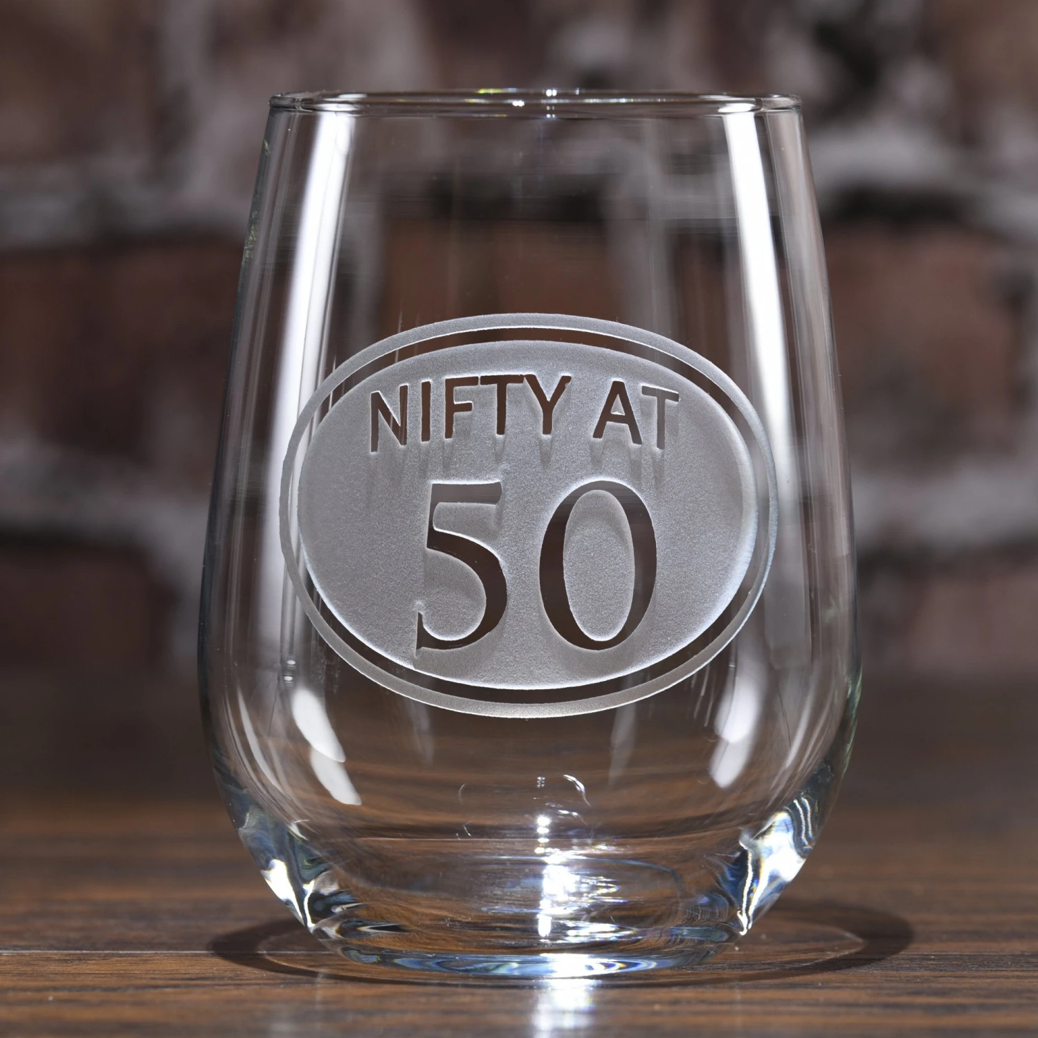 Our engraved 50th Birthday Stemless Wine Glass is a classy way to celebrate a 50th birthday for that special man or woman in your life. Celebrate this milestone birthday and give a keepsake gift the birthday girl or boy can display proudly for years to come and recall their special celebration. Deeply carved using our sand carving technique, each of our custom stemless wine glasses are meticulously custom made to order making them the perfect gift for those seeking unique gift ideas for wine lovers – men and women alike. At 4.5″ high our 50th birthday wine tumbler holds 16 oz of your favorite wine in style. A custom engraved stemless wine glass will be the favorite gift at any special gift giving occasion. Personalized or monogrammed stemless wine glasses are a unique and special bridal shower gift, engagement gift, wedding gift or engagement gift. Also great gift idea for girlfriend or wife gifts, boyfriend or husband gifts, retirement gift or birthday for the classy man or woman who has everything. Dishwasher safe.