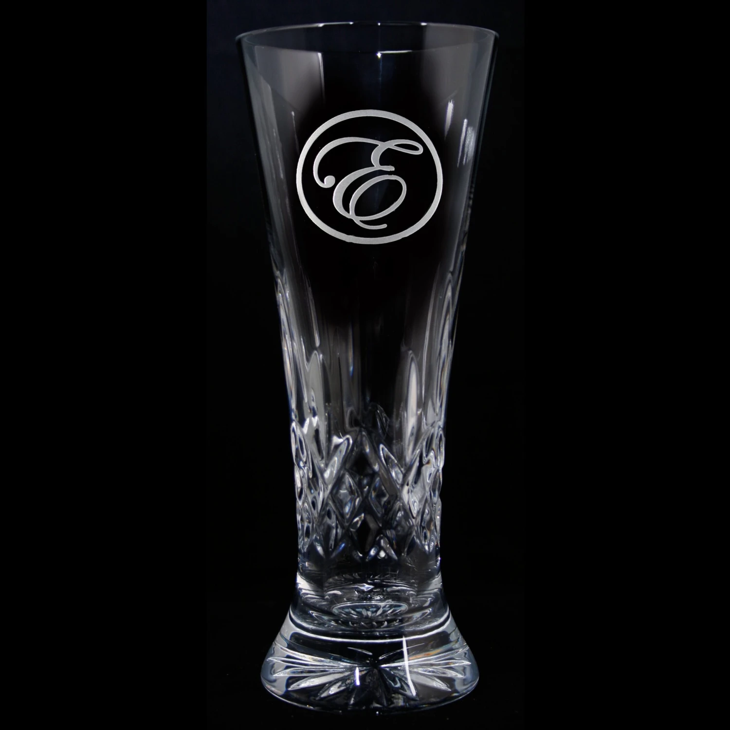 Pilsner monogrammed crystal glasses set. Waterford Crystal Lismore Pilsner Tall Beverage Glass PAIR with free personalization! Features the timeless Edwardian Script font monogram for a classic gift idea for your favorite beer lover, man who has everything or the bride and groom. Deeply carved using our sand carving technique, each pilsner glass is carefully custom made and hand crafted to order by our master glass artisans making it the perfect gift for those seeking a beautiful iced beverage glass and a unique gift ideas for men and women who love craft beer or home brewing.