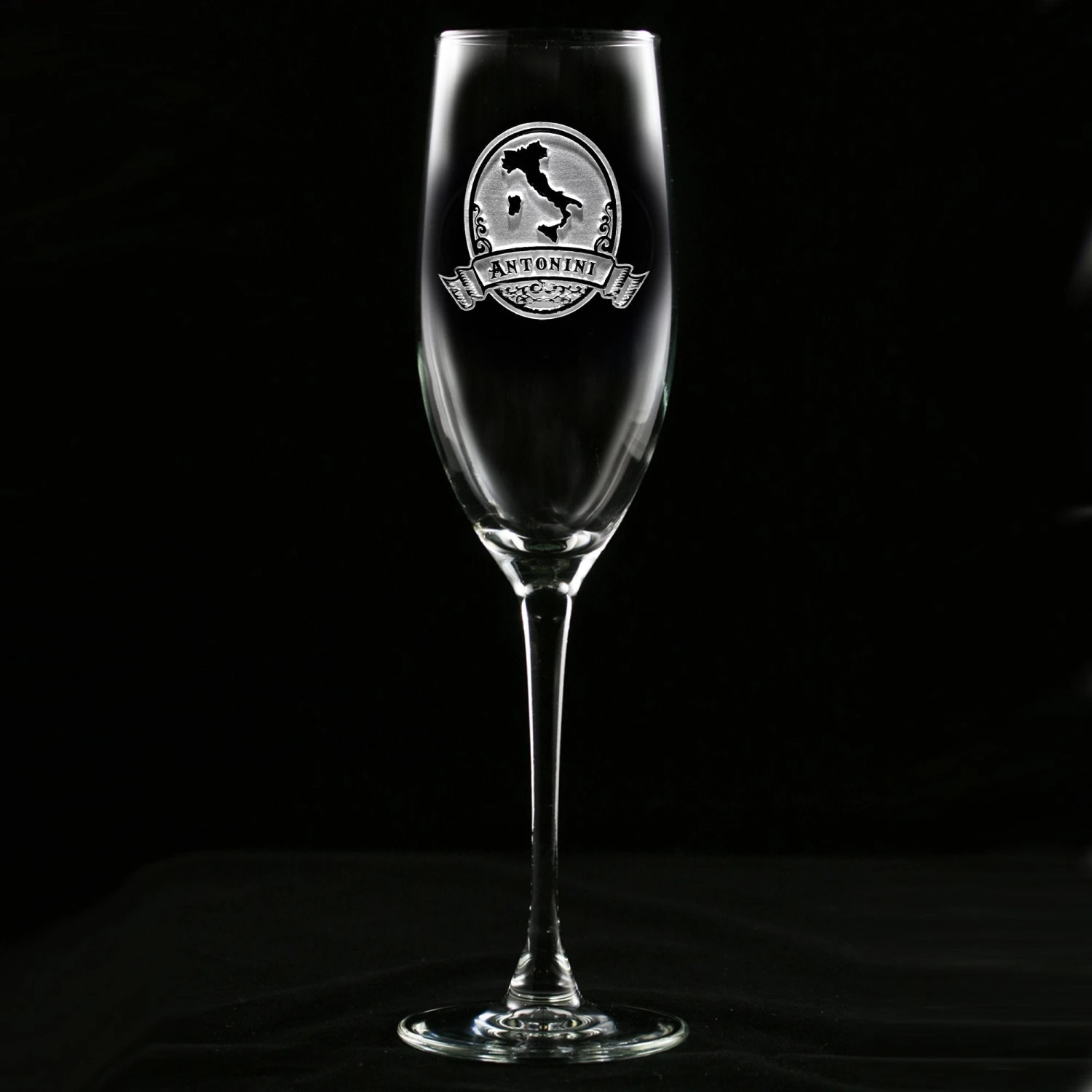 Proud of your Italian heritage? We’ve got a beautiful set of Italian champagne toasting flutes, champagne glasses, wine, scotch, beer mugs, goblets, and more to help you celebrate your Italian pride in style! Our beautiful hand-carved personalized champagne glasses feature a stunning background panel that is meticulously carved away leaving the peninsula of Italy raised from the monogrammed champagne flute in a beautiful 3D manner. A flowing name banner features your last name (surname) to personalize this Italian champagne toasting glass for you. Our Italian barware makes a perfect wedding toasting glass set for a traditional Italian wedding or gives a set as a wedding or anniversary gift to a special Italian couple. Famiglia is really important to our Italian friends so a set of glassware with the family name featured so beautifully would be the most appreciated gift for any recipient for any special occasion.