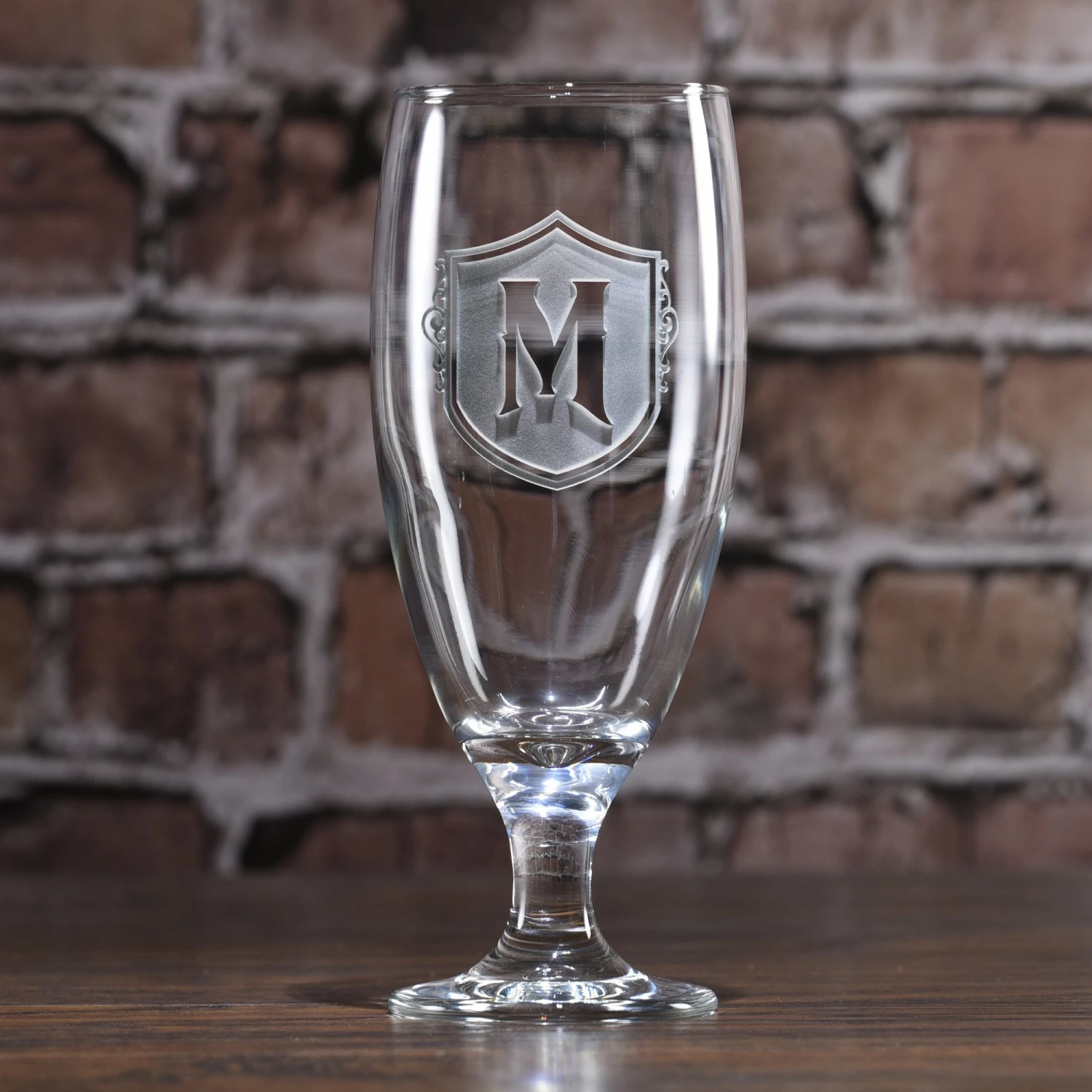 An elegant wedding gift idea or bridal shower gift, our engraved monogram water goblet is also a great iced-tea glass and footed beer glass for home brewed beer or craft beer enjoyment. Deeply sand carved by our master carver, your glass goblet features a stunning old world style shield design carved out of the goblet’s surface leaving the monogrammed initial raised from the bar glass in a 3D fashion.Our goblets are 7.5” high and hold 16 oz.