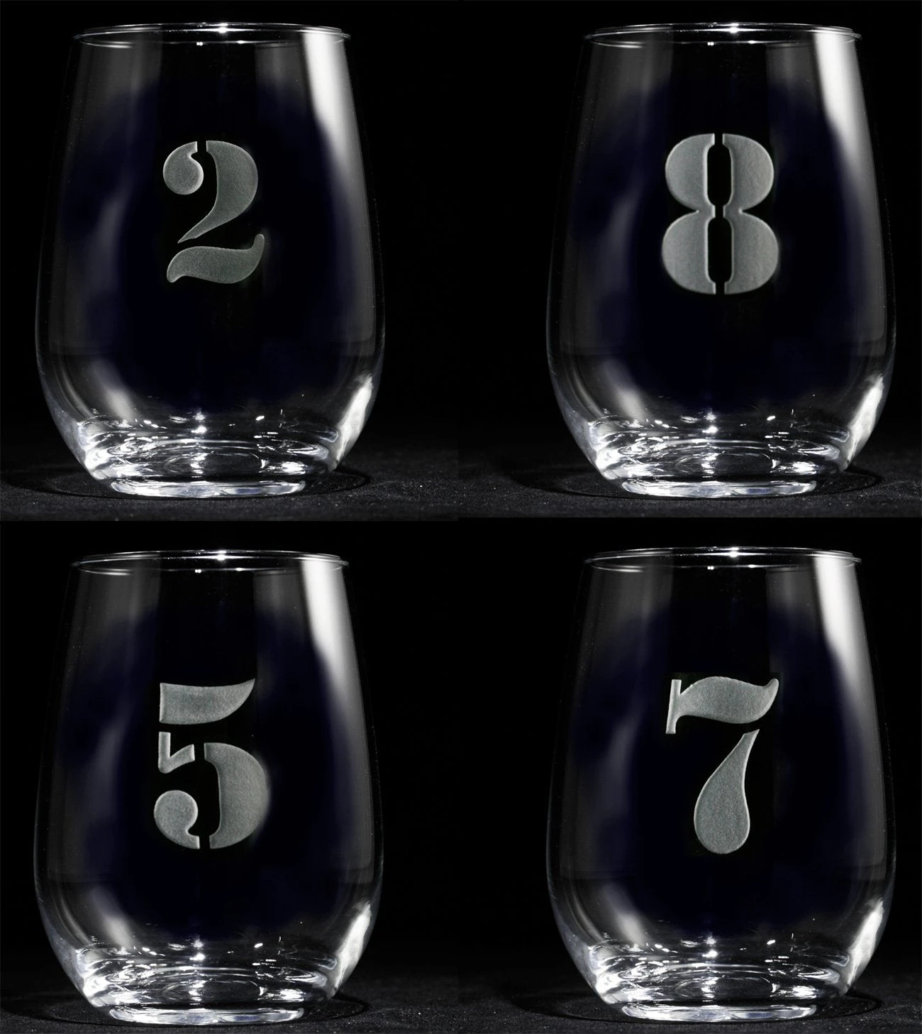 Our numbered stemless wine glass set is a perfect way to keep track of your wine drink at the party! An 8 glass set, we have engraved 17 oz numbered one through eight stemless wine glass set is a classy wedding, anniversary, bridal shower, engagement or birthday party gift. Also makes a great housewarming gift for a new neighbor. Deeply carved using our sand carving technique, each of our custom numbered wine glasses are meticulously custom made to order making them the perfect gift for those seeking unique gift ideas for wine lovers – men and women alike. At 4.5″ high our custom stemless wine glass holds 17 oz of your favorite wine in style. A custom engraved stemless wine glass will be the favorite gift at any special gift giving occasion. Personalized or monogrammed stemless wine glasses are a unique and special bridal shower gift, engagement gift, wedding gift or engagement gift. Also great gift idea for girlfriend or wife gifts, boyfriend or husband gifts, retirement gift or birthday for the classy man or woman who has everything.