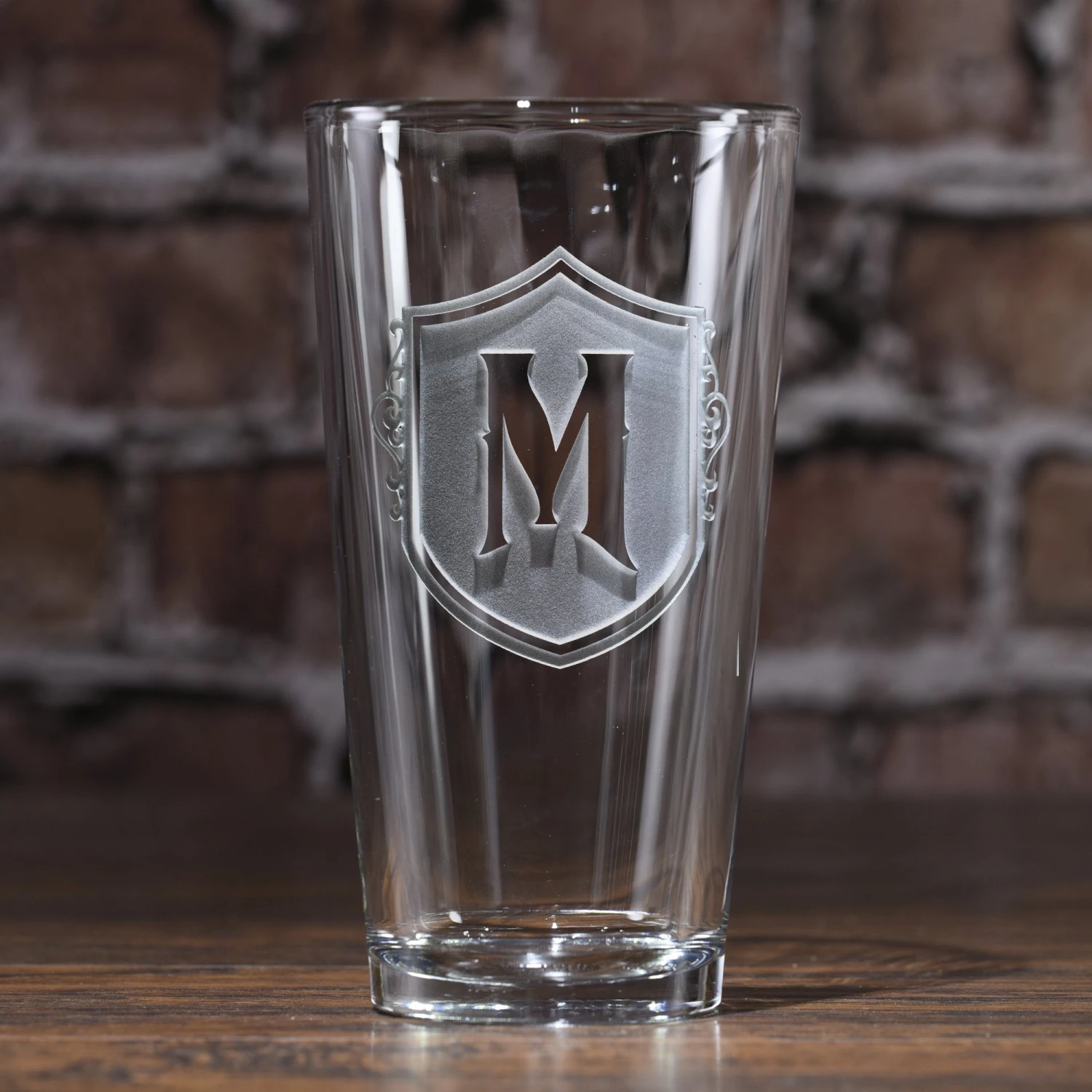 An awesome groomsman gift or best man gift to give your groomsmen who are there to help you celebrate your special wedding day. Our deeply engraved (sand carved) shield design is crafted by our master carvers to allow the old world style font monogram initial raised from the pint or pub glass surface for a jaw-dropping effect.