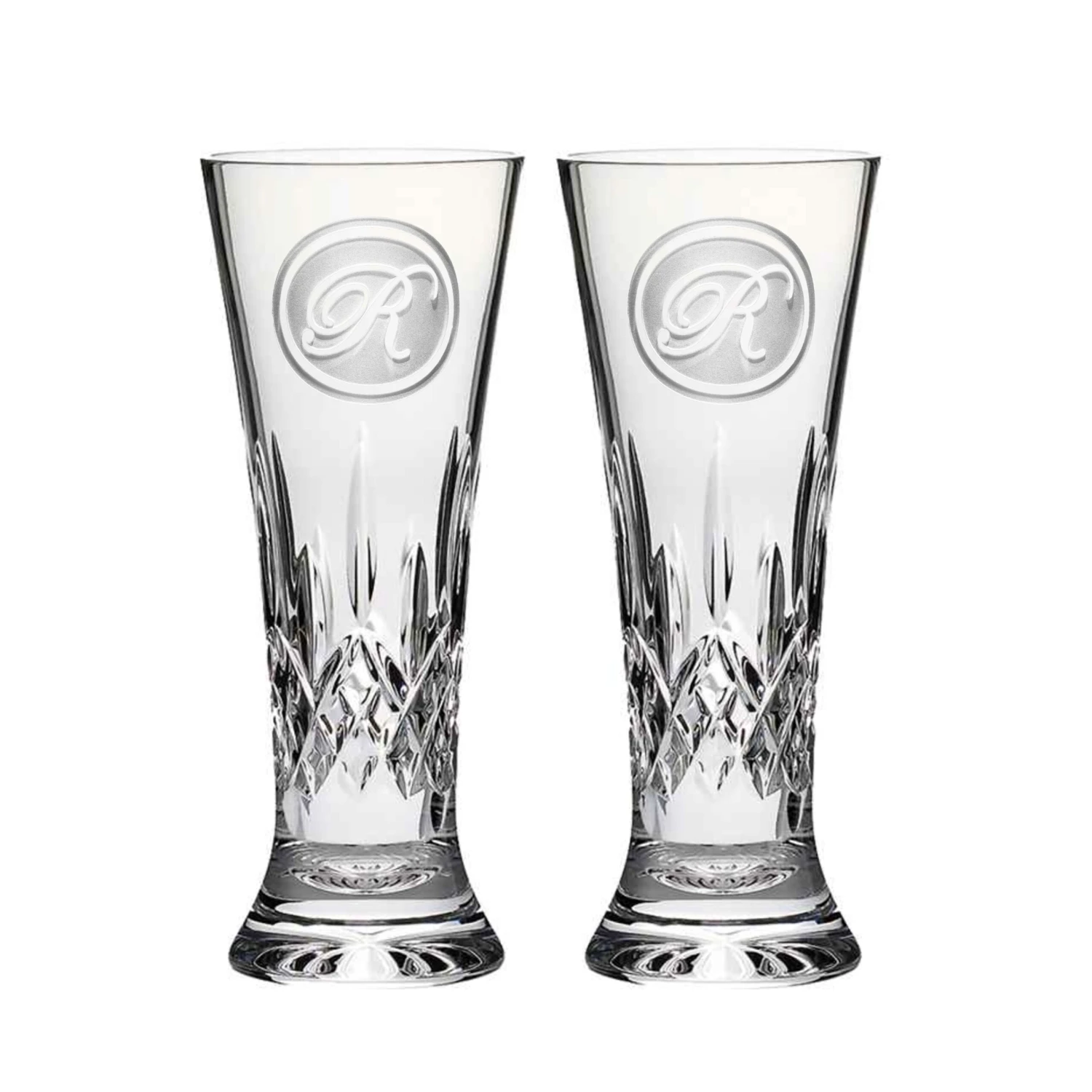 Engraved Waterford Crystal Pilsner glass set is custom etched by Crystal Imagery with a classic Edwardian Script font. The Waterford Crystal Lismore Pilsner Tall Beverage Glass PAIR features free personalization making a classic gift idea for your favorite beer lover, manor woman who has everything or the bride and groom. Deeply carved using our sand carving technique, each pilsner glass is carefully custom made and hand crafted to order by our master glass artisans making it the perfect gift for those seeking a beautiful iced beverage glass and a unique gift ideas for men and women who love craft beer or home brewing.