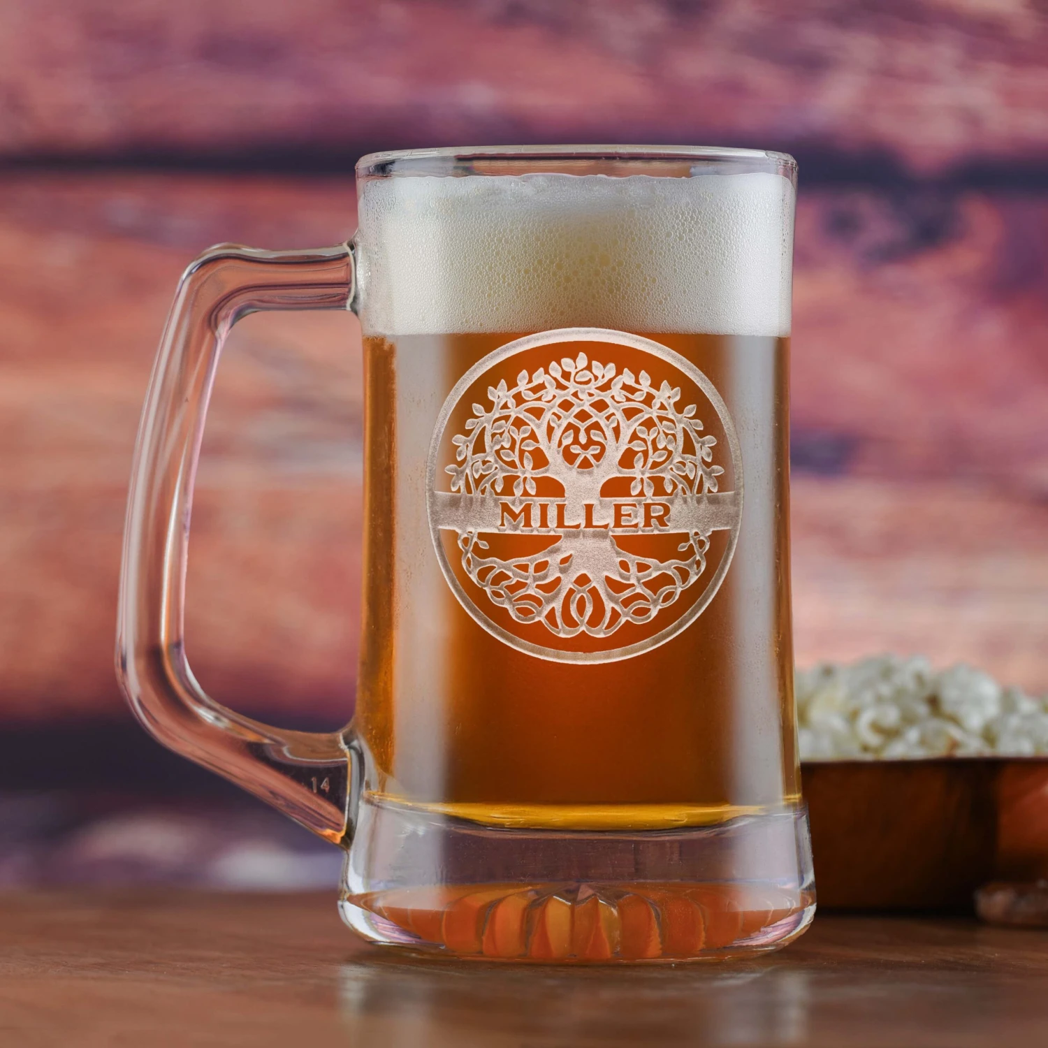 _The Family Tree engraved beer mug features a beautifully, deep etched tree and roots design with your family’s last name or surname proudly displayed in a banner across the design. This gorgeous gift for the bride and groom, anniversary couple, or for any man or woman who is proud of his or her heritage, will be a used and appreciated for years to come. This custom monogrammed beer mug is meticulously hand carved by our master carvers and trained artisans to create a stunning 3D finish on your custom beer glass that is unmatched by simple surface engraving or etching.