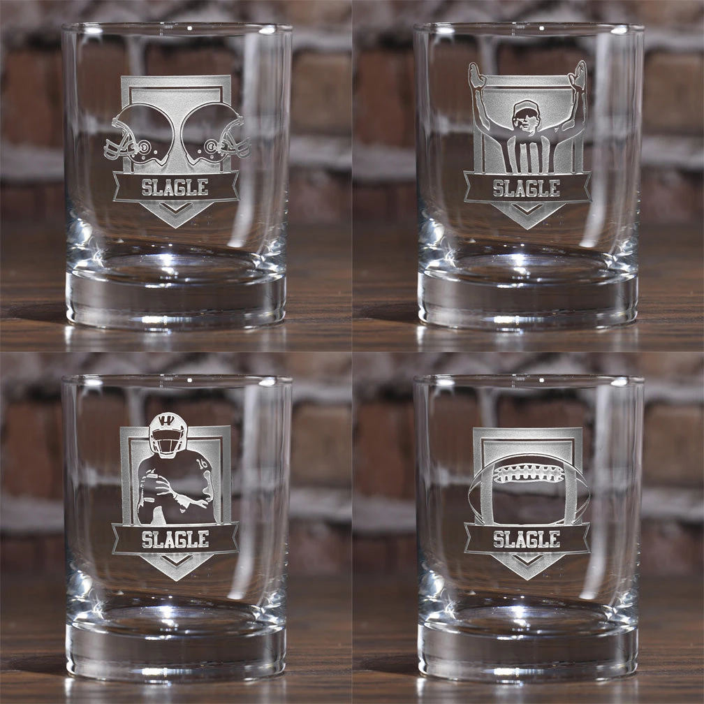 We have designed a series of four football themed DOF glass designs including a referee, helmets, goalpost and pigskin to delight all you football fans. And the best part, these double old fashioned glasses are personalized with your name of choice.