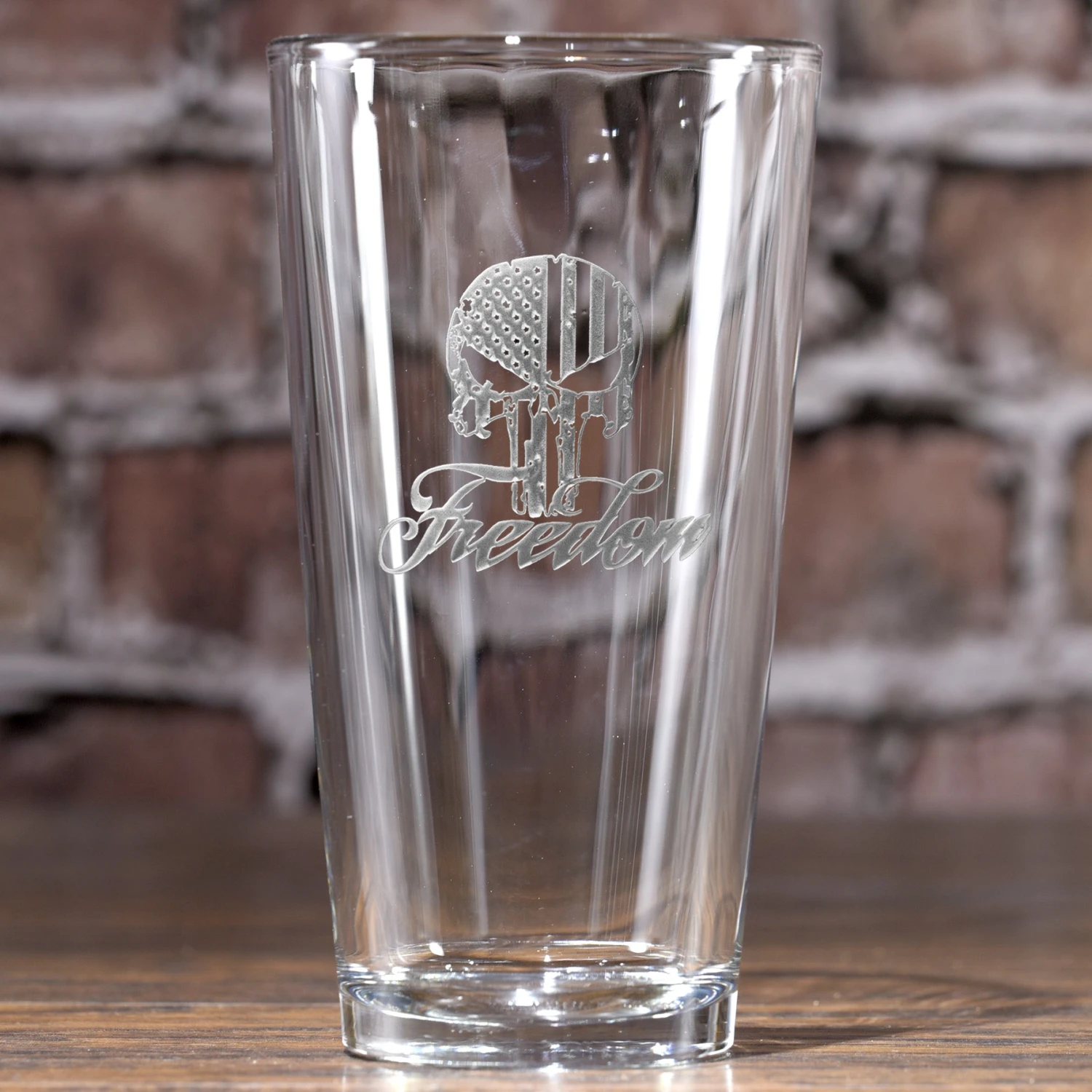 This engraved Freedom Skull Stars and Stripes Pint Beer Glass is a great Americana gift for our loyal freedom and liberty loving American patriot. Our badass USA barware line by Crystal Imagery is a classy gift for military personnel, police officers and other red-blooded Americans who proudly tout their loyalty to our flag and country. Deeply carved using our sand carving technique, each pub glass is meticulously custom made to order making it the perfect gift for those seeking unique gift ideas for beer lovers – men and women alike. Dishwasher safe but we recommend hand washing.