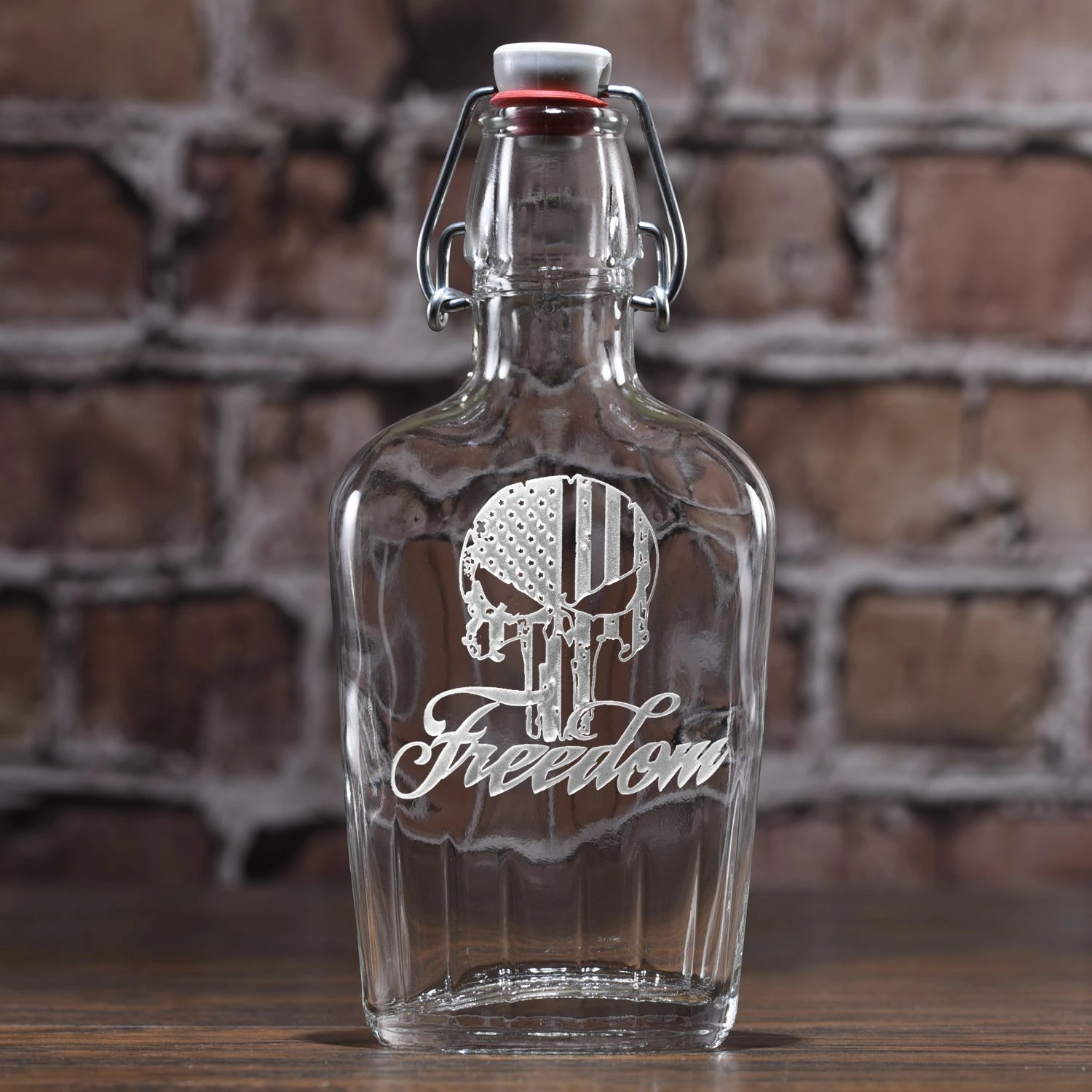 This engraved Freedom Skull Stars and Stripes Whiskey Glass is a great Americana gift for our loyal freedom and liberty loving American patriot. Our badass USA barware line by Crystal Imagery is a classy gift for military personnel, police officers and other red-blooded Americans who proudly tout their loyalty to our flag and country. Deeply carved using our sand carving technique, each whiskey, scotch, or bourbon glass is meticulously custom made to order making it the perfect gift for those seeking unique gift ideas for whiskey lovers – men and women alike. Deeply carved using our sand carving technique, each flip-top USA flask is meticulously custom made to order and personalized with your name in the banner making it the perfect gift for those seeking unique gift ideas for whiskey, bourbon and scotch lovers – men and women alike. This patriotic gift for him has a leak-proof rubber seal. With endless customization options, we have a flask for any whiskey, scotch, bourbon or rye lover you know. Our master glass carvers will sand-carve your keepsake glass whiskey flask for you in an old-world style that is unmatched by engravers and etchers. After our in-house design team creates your custom design, our glass carvers will meticulously carve away a background from the glass, leaving the monogram or personalization untouched and raised from the glass surface in a breath-taking three dimensional manner, unlike engraved or etched gifts others are offering you, making this the perfect skull gift for men and groomsmen. Each personalized glass flask measures 8″H x 3 3/4″W x 1 1/2″H, and holds 8.5 ounces. Each of our USA flasks will arrive beautifully gift boxed for jaw-dropping presentation to your gift recipient.