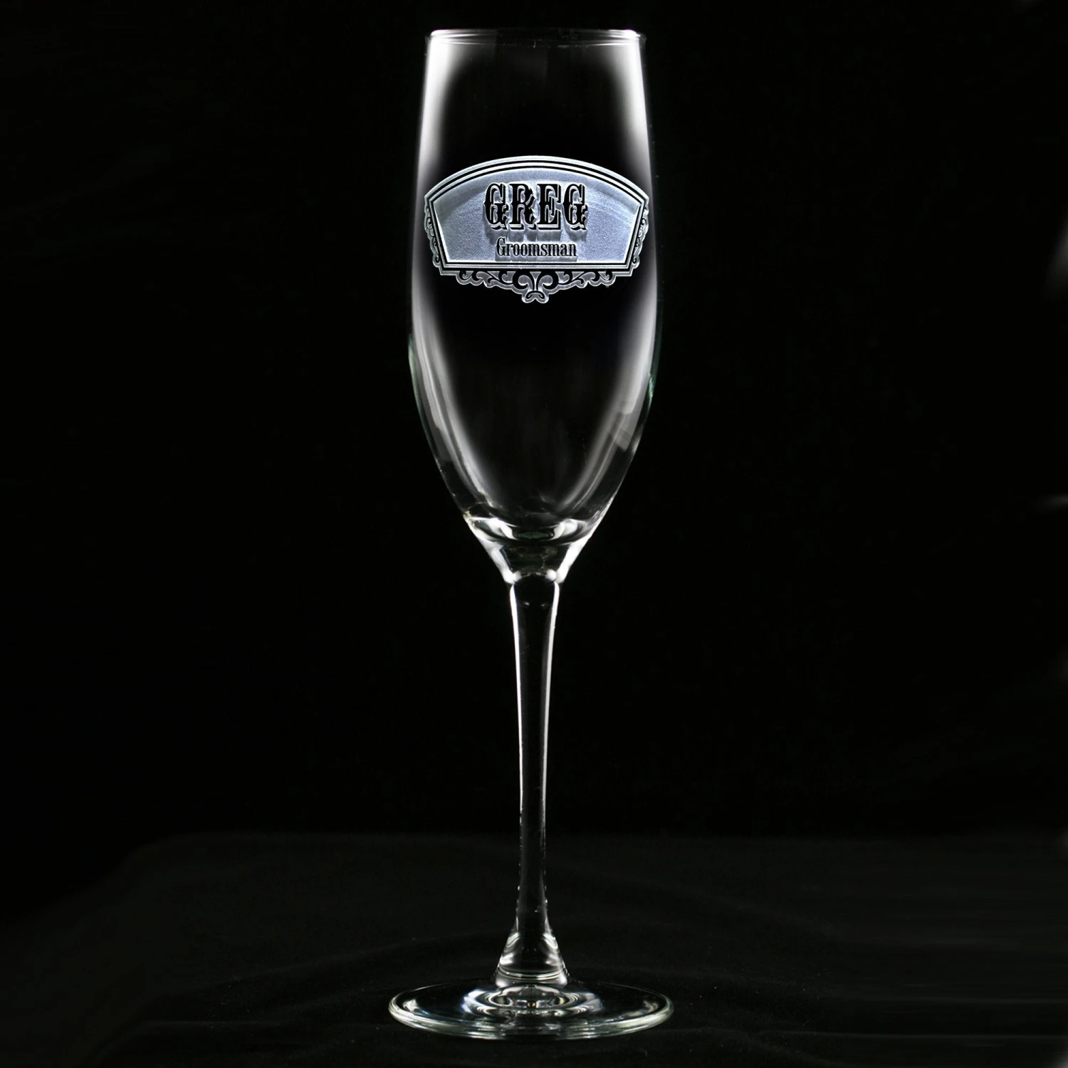 Groomsman, Best Man, Usher, Father of the Bride, Father of the Groom and Groom champagne toasting glasses are personalized with both the title of your groomsman and his name, making these bridal party toasting glasses the perfect groomsmen gift idea. These bridal party champagne flutes are stunning with their deeply engraved background panel that is carved away to leave the words and design raised from the glass surface. Price break will be given as each item is added to the cart. First select the title, then insert the name and hit order. Then continue with each additional title and name and when each one is added to the cart, your quantity price break will activate, bringing the individual price per glass down. These beautifully carved bridal party glasses are truly a keepsake gift to show your appreciation to your groomsmen and best man and is perfect for use during the wedding reception and for that special toast to the bride and groom. These engraved groomsmen champagne glasses are a gift he will enjoy for years to come. At 9.5″ high x 2″ wide, our champagne flutes and glasses hold 8 oz. and is dishwasher safe. *NOTE: Matching bridesmaid champagne glasses are available.