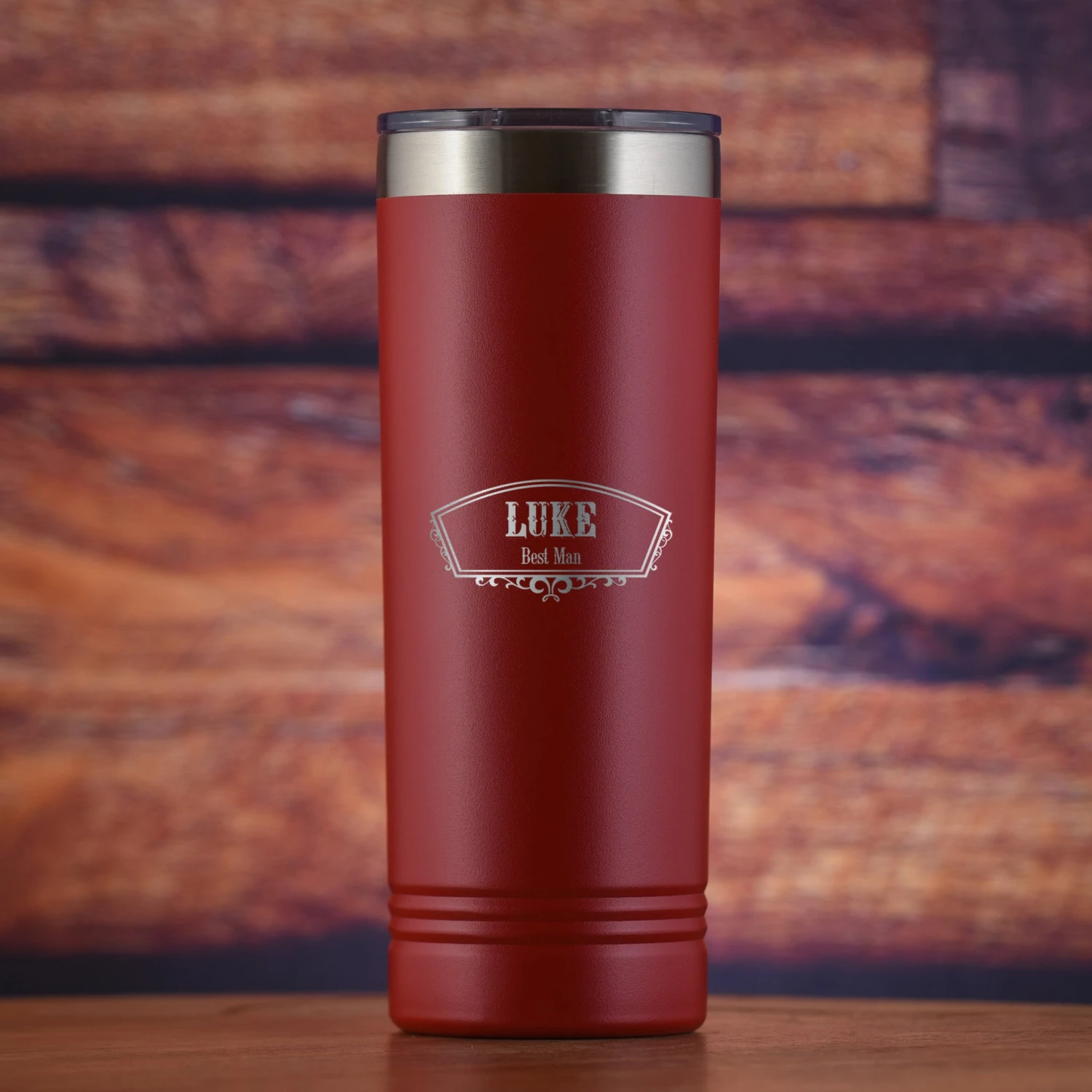 Personalized groomsman and best man skinny tumbler with slider lid. Our skinny travel tumbler is perfect for hot coffee or cold beverages on the run and fits most cup holders in your car, jeep or truck. The opening in the lid is also big enough for a straw! We selected these Polar Camel 22 oz. slim vacuum insulated travel tumblers for their high quality and durability. We laser etch our custom designs into the powder-coated monogrammed yeti style tumbler, which creates the design in a sleek stainless steel finish.