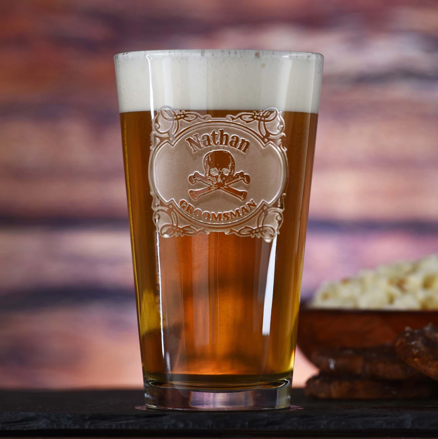 Groomsman skull and bones pint beer glass gifts are a cool gift idea for the wedding party and attendants! Order a personalized pub glass for each of your ushers and best man to ensure they receive a gift he will enjoy for many years to come. Select the title and name for each person in your bridal party and as you add each glass to your cart, your price will reduce. Choose from titles for your Groomsman, Best Man, Usher, Father of the Bride, Father of the Groom and even grab one for the Groom. Our master carvers will hand-craft each deeply engraved mug. We sand-carve around the lettering leaving the personalization untouched so it is raised from the glass surface so your pub glasses have an awesome 3D look and feel. These are not your common engraved glassware found at the mall kiosk! These custom glasses are a gift that will make them say “wow” when they see them. At 5.75″ high by 3.3″ wide, our custom beer glass holds 16 oz of your favorite brew in style. Dishwasher safe. Made in the USA.