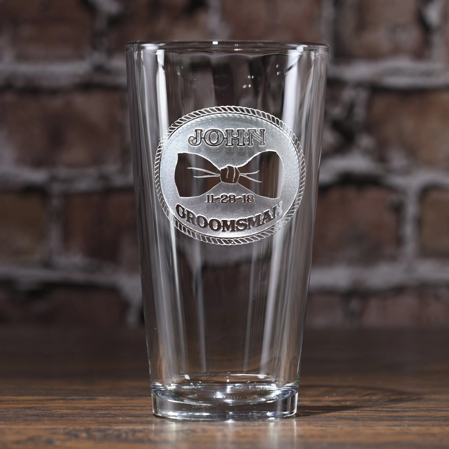 Groomsmen bow tie beer glasses such as our pint pub glass, makes a thoughtful gift for your best man and wedding party attendants. This engraved beer glass is custom made to include your wedding date, the title of your groomsman and his name to make this engraved glass gift one that he will use over and over again. These personalized beer glasses for groomsmen, bridesmaids and special wedding party members are stunning with their deeply engraved background panel that is carved away to leave the words and design raised from the pilsner glass surface. Price break will be given as each beer glass is added to the cart. First select the title, then insert the name and wedding date, and hit order. Then continue with each additional date, title and name and when each one is added to the cart, your quantity price break will activate, bringing the individual price per personalized groomsman pub beer glass down. These beautifully carved wedding party beer glasses are truly a keepsake gift to show your appreciation to your groomsmen and best man and is perfect for use during the wedding reception and for that special toast to the bride and groom. These engraved best man pint glasses are an engraved groomsmen gift he will enjoy for years to come. Measures 6′ high by 3.5′ wide. At 16 oz, our groomsmen pint glasses will hold plenty of your favorite beverage. Dishwasher safe. Made in the USA.