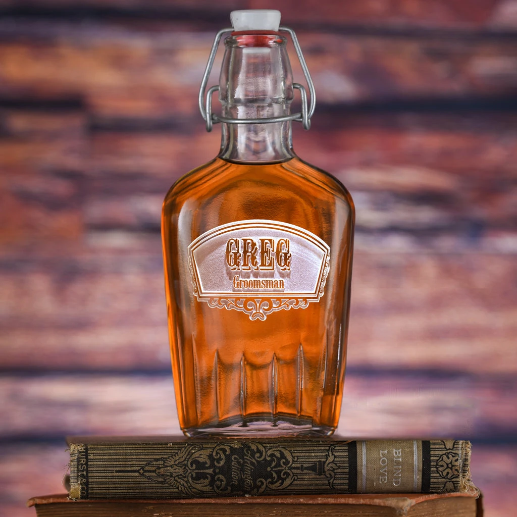 Engraved groomsmen flasks are a cool personalized bridal party gift for your groomsmen and best man he will use and appreciate for many years to come. Fill the best man flask or groomsman flask with your beverage or spirit of choice, and you’re set to celebrate, no matter where the party takes you. Wouldn’t it be cool to give these to your groomsmen at the bachelor party to enjoy during one of the most memorable nights of your life? Our cool glass pocket flask has a vintage appeal with its old-school style swing top. This hip flask has a leak-proof rubber seal.