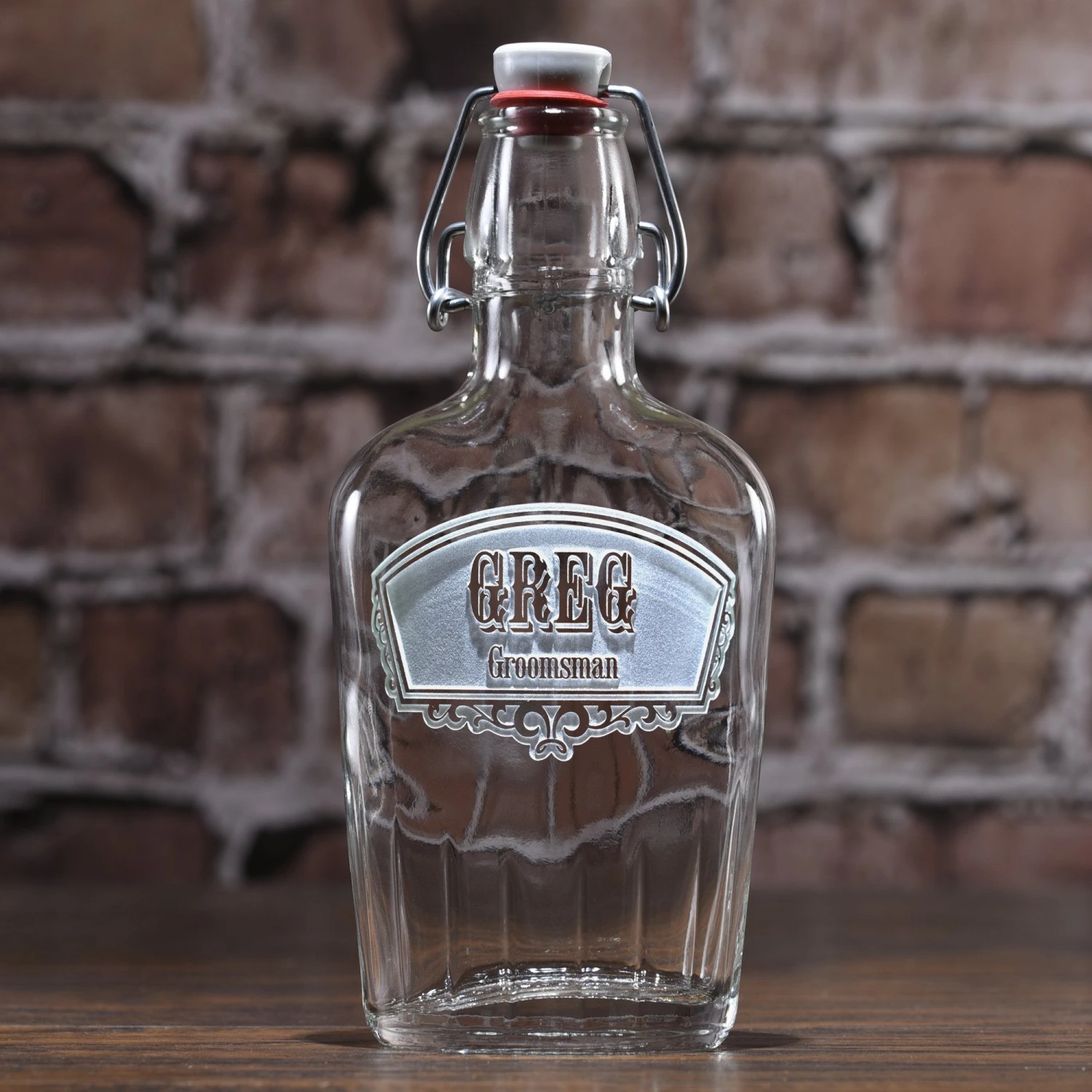 With endless customization options, we have a flask for any whiskey, scotch, bourbon or rye lover you know. Our master glass carvers will sand-carve your keepsake glass whiskey flask for you in an old-world style that is unmatched by engravers and etchers. After our in-house design team creates your custom design, our glass carvers will carve away a background from the glass, leaving the monogram or personalization untouched and raised from the flask surface in a breath-taking three dimensional manner unlike engraved or etched flasks others are offering you, making this the perfect gift. Each personalized glass flask measures 8″H x 3 3/4″W x 1 1/2″H, and holds 8.5 ounces. Each of our custom groomsmen flasks will arrive beautifully gift boxed for jaw-dropping presentation to your gift recipient.