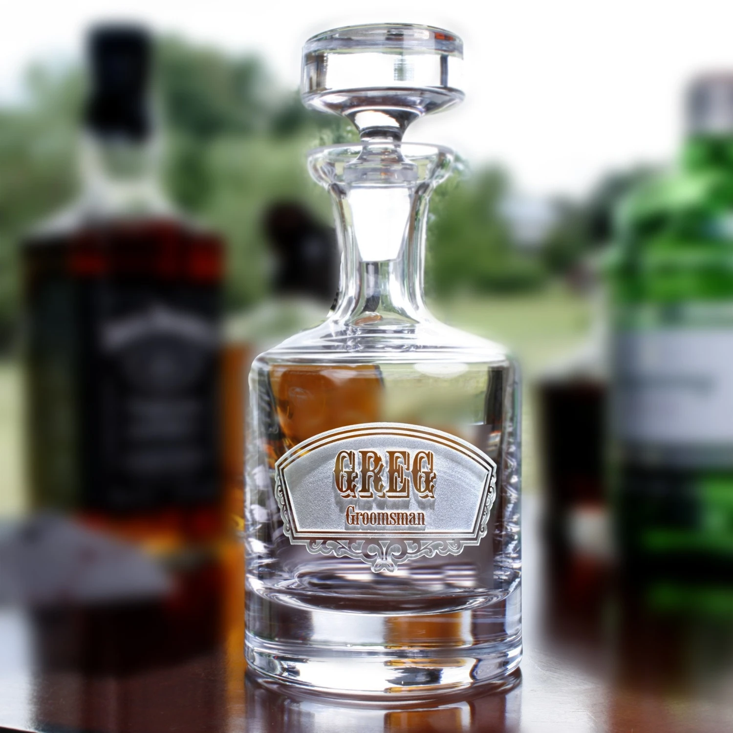 Engraved Groomsmen Whiskey Scotch Decanter, Personalized Bridal Party Attendant Gifts. Our custom engraved groomsmen decanters are really cool groomsmen gift ideas. Choose the title of your groomsman and add his name to make a personalized gift for each wedding attendant to create a Best Man decanter, Groomsman decanter, Usher decanter, Father of the Bride, Father of the Groom and even grab on for the Groom! Our personalized whiskey decanters or scotch decanters for groomsmen are hand-crafted by our master carvers. Our engravers will not just etch the surface of your decanter, but instead they will carve out a beautiful background panel from the glass, leaving the lettering untouched and raised from the decanter surface in a stunning three-dimensional manner, creating a groomsman gift or best man gift that will make jaws drop. These custom decanters are of such high quality and so beautifully carved, that your buddies will want to display this gift proudly in their homes to enjoy for years and years to come. All the while, he will be thinking of his happy times with you, his friend. That is a truly awesome gift for your best man and groomsmen and unlike any he would have received before! At 10.5″ high, our engraved decanters hold 28 oz of your favorite spirit. Dishwasher safe.