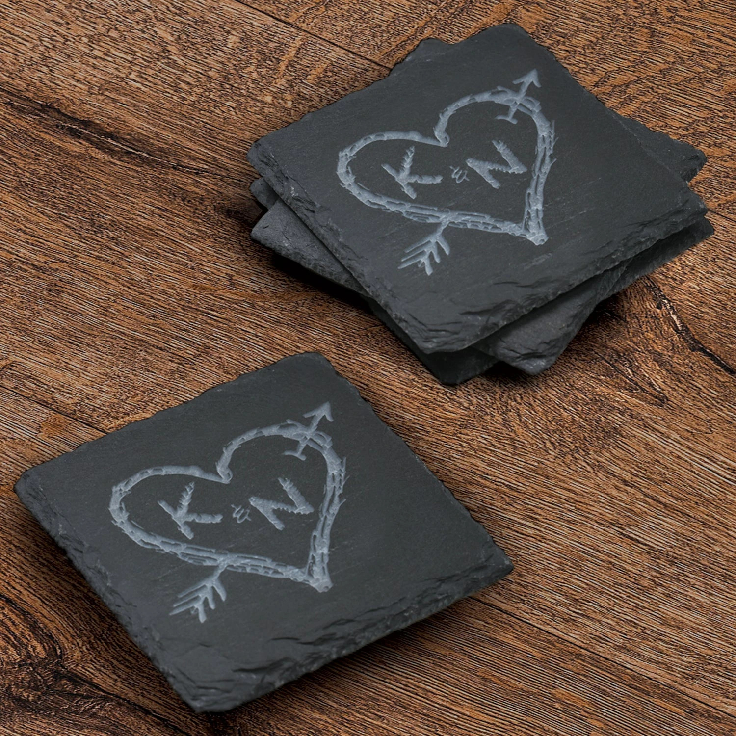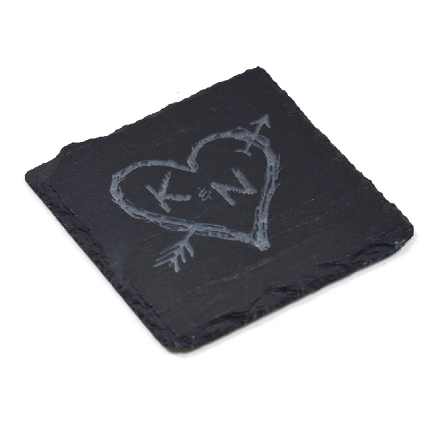 Our Heart and Arrow custom square slate coasters offer a rustic and classic way to protect your tabletops and surfaces from glass condensation, while looking beautiful. Deeply etched, these monogrammed slate coasters feature EVA bottom pads to help avoid spills, and naturally edged rims that will add a finishing touch to the dcor of your space. Slate is a natural and durable material that can endure a wide range of temperatures Ð owners can feel safe using with both cold and hot drinks. Shop our square slate coasters custom engraved with a logo design or custom message to keep around your home wet bar, man cave or restaurant Ð you can even extend them as giveaway items or favors at upcoming events. Perfect wedding gift, housewarming or hostess gift for Christmas and other holidays.