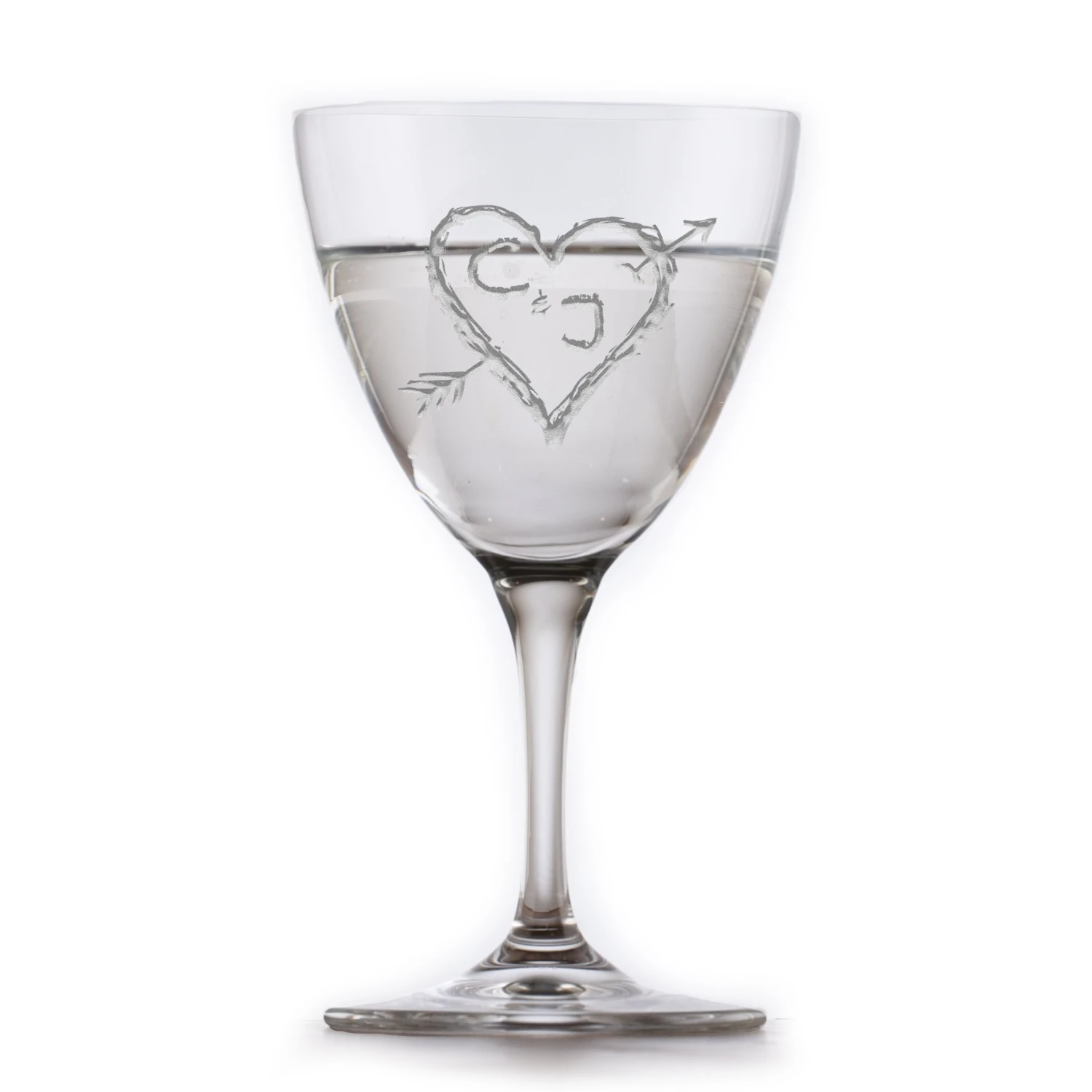 Heart and Arrow Nick and Nora Martini Glass etched by Crystal Imagery, showcases the monogram initials of two lovers inside a heart with arrow as if carved into a tree. A great Valentine’s Day, wedding or anniversary gift. Perfect for cocktails including sidecars, gin rickeys, manhattans, and martinis, this Stolzle 4790005T 5.75 oz. Nick and Nora vintage martini glass features a rounded bowl that’s easier to sip from than a traditional martini glass.