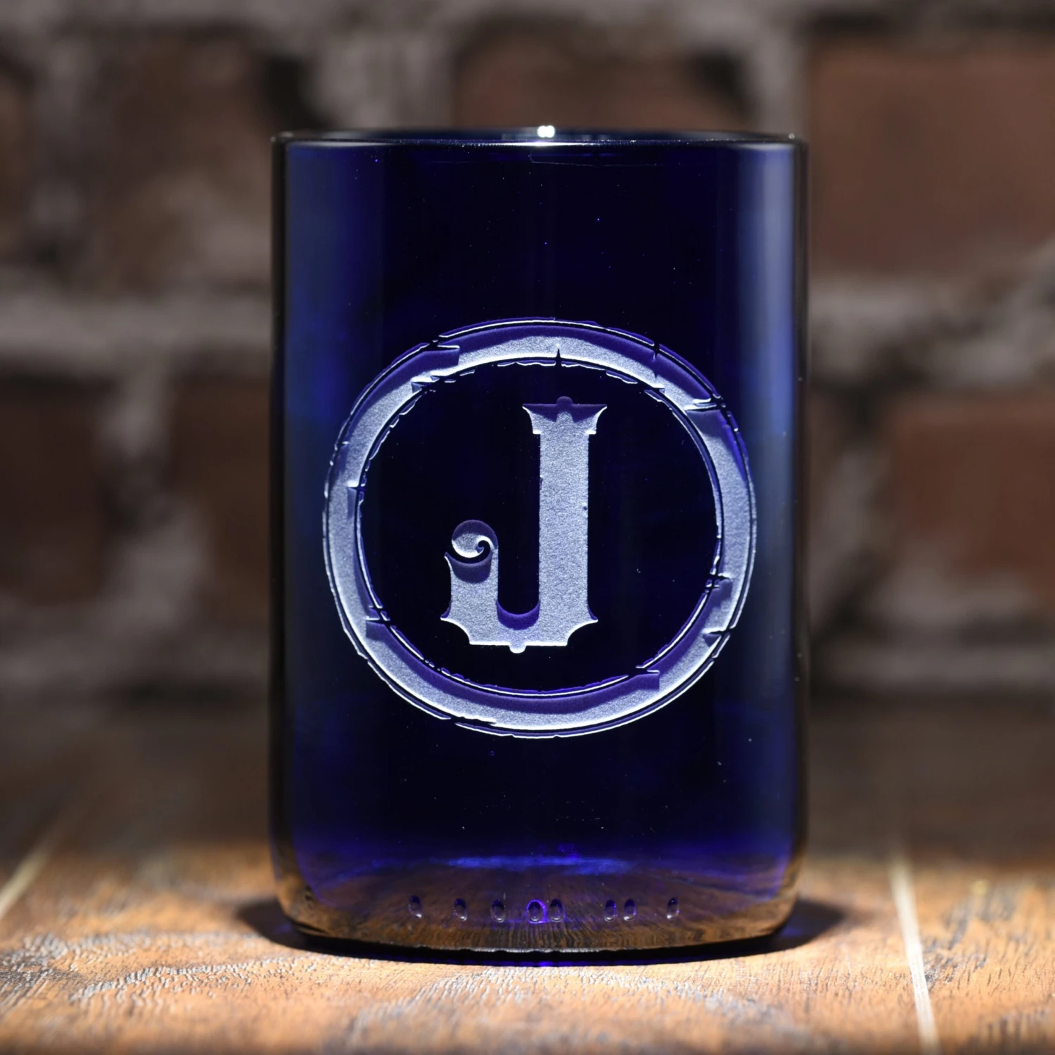 Our initial letter monogram on reclaimed wine bottle tumblers are recycled from blue wine bottles and meticulously sand-carved by hand with your monogram initial and last name in our custom design. Create a beautiful table with our colored glassware or give a unique gift to that person who has everything. Our wine bottle drinking glasses hold approximately 12 oz and measure 4.5″ high by 3″ wide. The lip of the repurposed wine bottle has been beautifully and carefully polished to a smooth edge for drinking. Dishwasher safe.