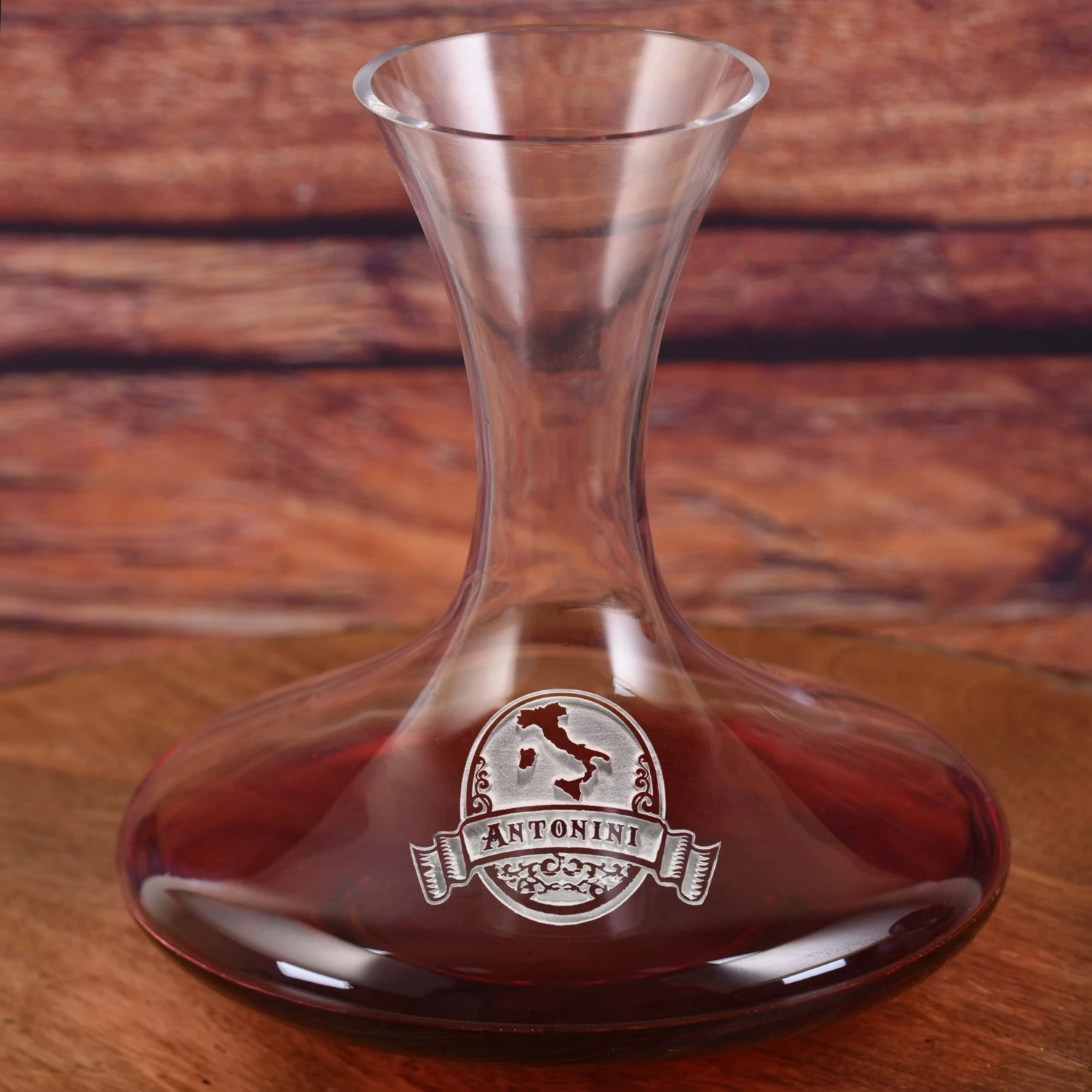 Italian wine decanter representing Italy. Our beautiful Italian design crystal wine decanter features a scrolling background panel with the country of Italy outlined within. At the bottom of the panel we set your family name across a scrolling banner to create a timeless and classic crystal wine decanter that will be cherished for generations. When you give our crystal wine decanters for special gift giving occasions, your gift recipient’s jaw will drop! Our deeply carved designs are stunning and unlike any etched or engraved wine decanters you’ve ever seen. Truly a unique and cherished gift for weddings, anniversaries, birthdays and holiday gift giving occasions. Not only are our Italian wine carafes a beautiful centerpiece to display in your dining room, wine cellar, office or bar cart, they serve a very important function as well. The most important functions of a wine decanter are to ensure that wine is properly aerated before serving. Our hand crafted custom engraved wine decanter by Crystal Imagery allows young wines to reach their fullest potential by increasing the wine surface to air ratio after a pour. The shape of the our personalized wine decanter lets the wine swirl freely during the pour, further activating oxidizing properties. As with all fine crystal wine products, our monogrammed etched wine decanter is hand crafted from the finest brilliant lead-free crystal in Europe.