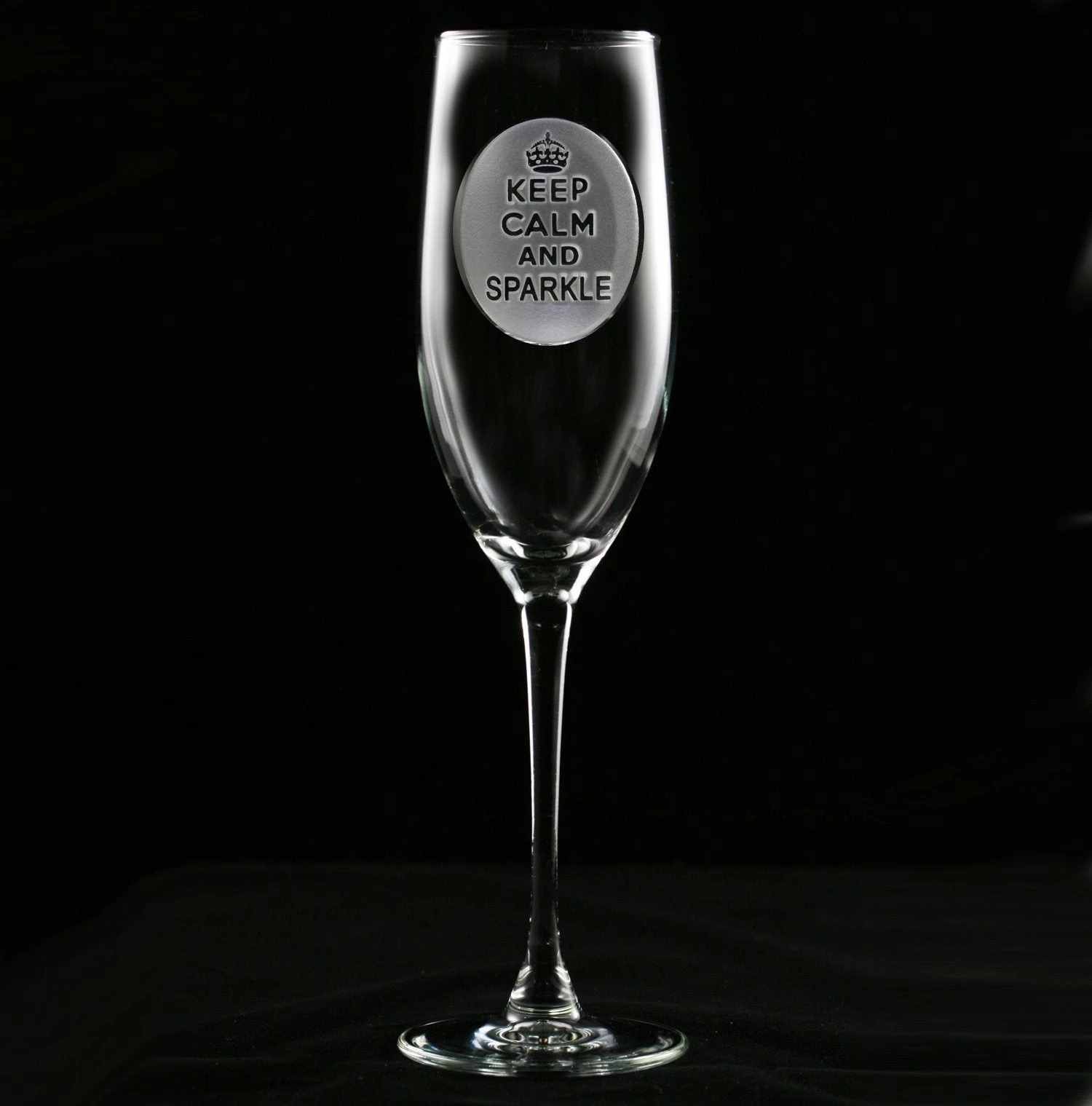 Our Keep Calm and Sparkle champagne glass is engraved with a regal crown atop the popular “Keep Calm and Sparkle” phrase on your favorite engraved barware collection that makes a perfect gift for woman at Mother’s Day, Valentine’s Day, Christmas, graduation, retirement, job promotion or anyt special occasion. Why not consider this beautiful engraved glass for bridesmaids or your Maid of Honor? Our master artisans deeply carve out the background of the glass design to leave the crown and Keep Calm and Sparkle sentiment raised from the champagne toasting glass surface in a stunning 3 dimensional manner.