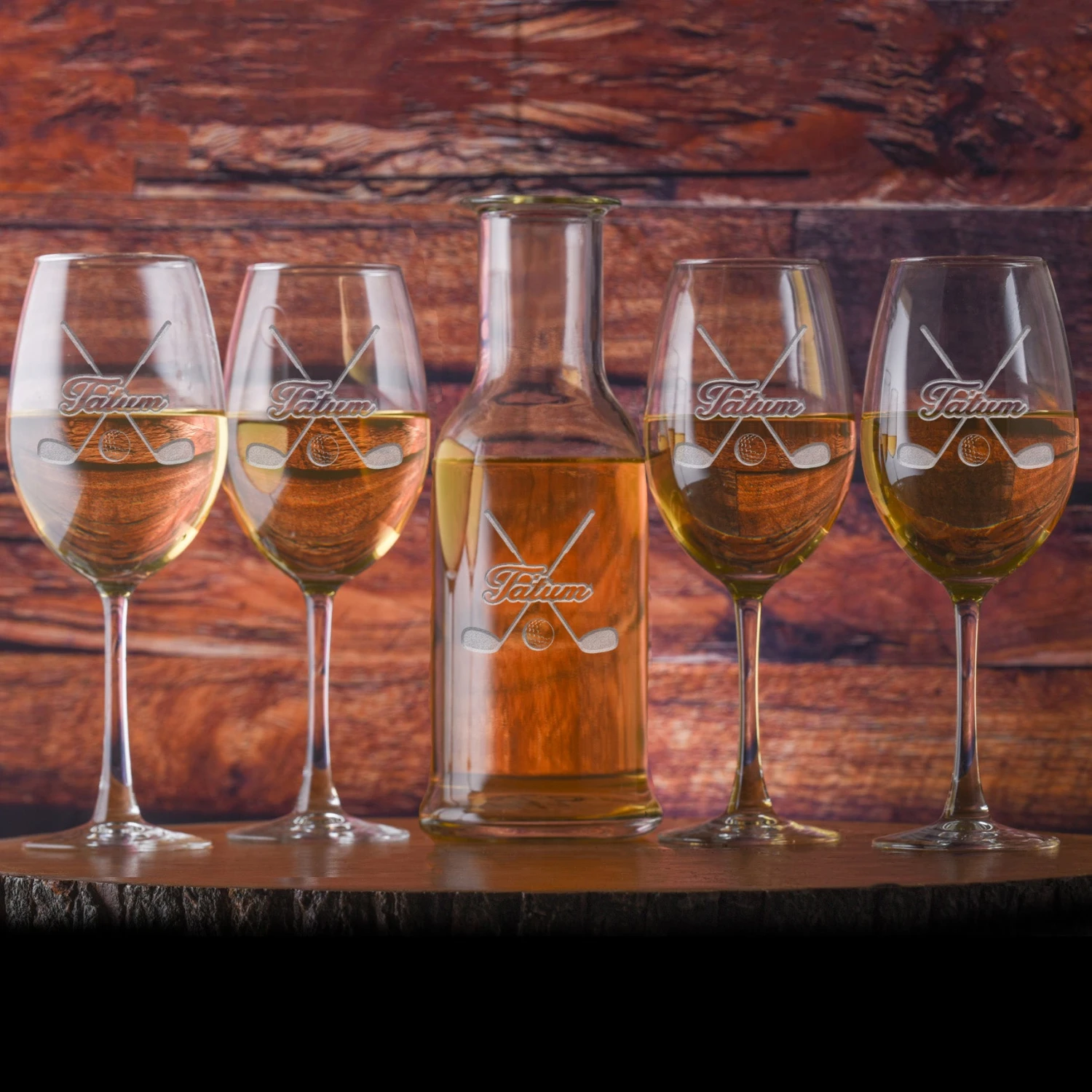Monogram Golf Engraved Stolzle Purity wine carafe including 4 standard wine glasses are deep carved for a superior finish. Crystal Imagery prides ourselves with providing a deep-relief, 3D finish when we custom engrave your barware gifts. Our artisans use a sand-carving method that canÕt be matched. We blast away surface of the glass to create a finish that is jaw-dropping. Stolzle glassware provides higher clarity and brilliance than glassware that contains lead. The smooth touch and delicate chime of Stolzle crystal glassware lets your customers know they are receiving the very best product and service possible. The best gift for any golfer, men and women in your life.