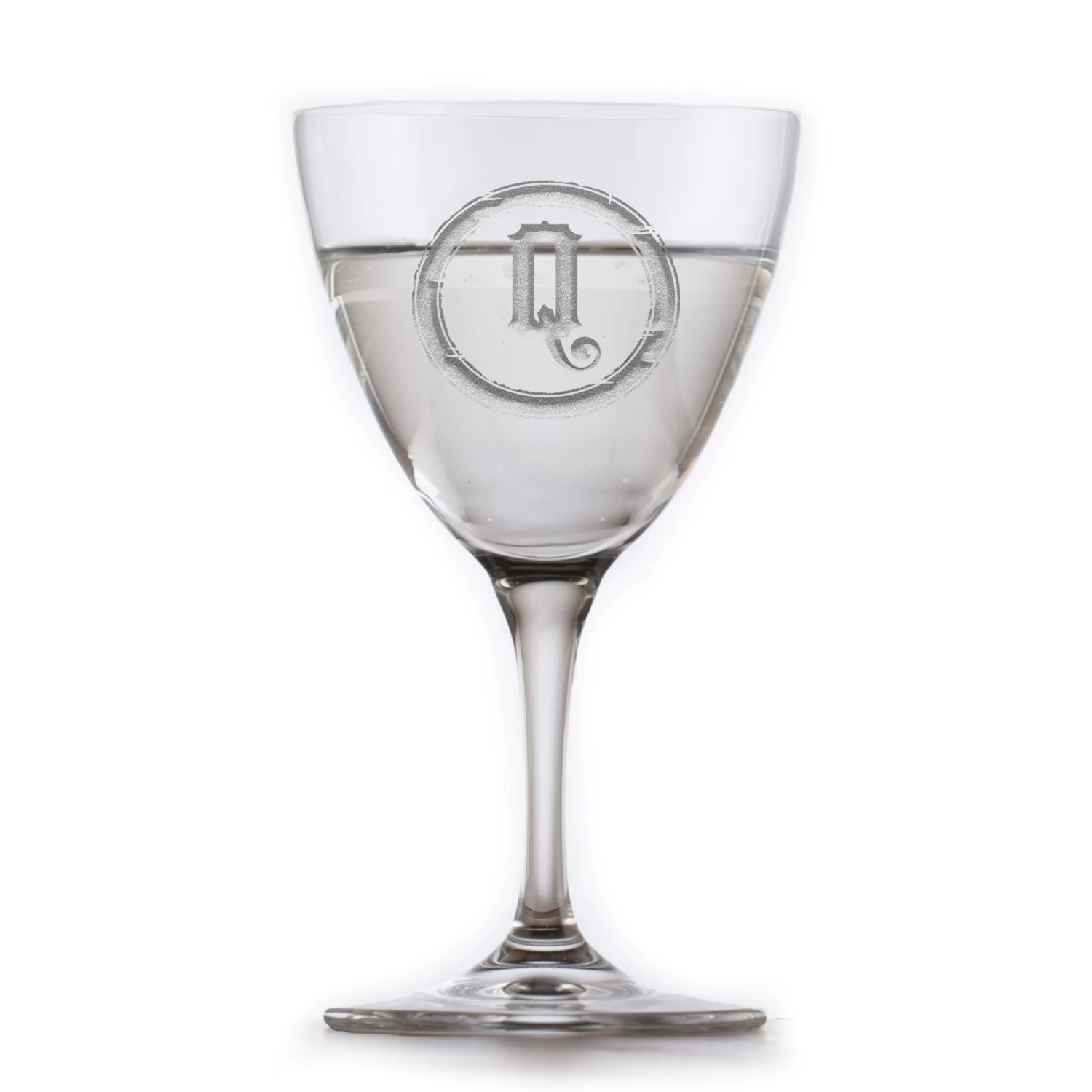 Monogram Nick and Nora Martini Glass engraved by Crystal Imagery. Perfect for cocktails including sidecars, gin rickeys, manhattans, and martinis, this Stolzle 4790005T 5.75 oz. Nick and Nora vintage martini glass features a rounded bowl that’s easier to sip from than a traditional martini glass.