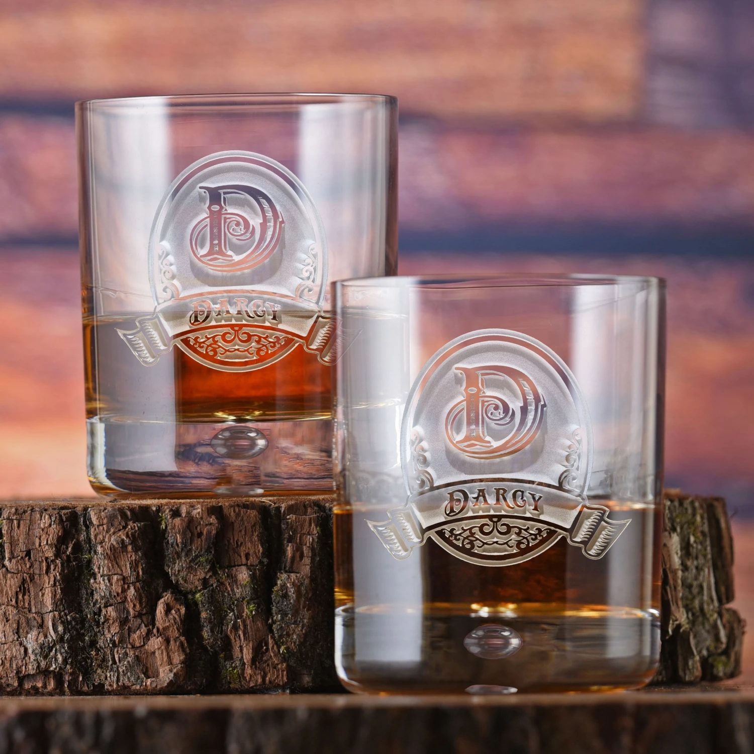 Monogrammed bourbon glasses that are engraved make memorable gifts for special family, friends, clients or business colleagues. Deeply carved using our sand carving technique, each bourbon glass is meticulously custom made to order making it the perfect gift for those seeking unique gift ideas for bourbon lovers – men and women alike. Our Bormioli Rocco quality bar glass is a traditional rocks and DOF glass with a gorgeous bubble inside the sham. This glass has nice clarity and weight and measures 3.75″ high by 3″ wide and holds 9.5 oz of your favorite cocktail.