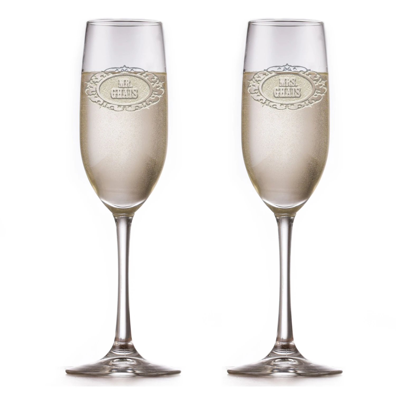 Our Mr. and Mrs. champagne wedding glasses are a perfect wedding gift, bride and groom toasting flutes or anniversary gift. Sold as a set of two, simply provide the last name to be inserted into each champagne glass and you have a truly special gift that will be used and appreciated for a lifetime of special occasions!