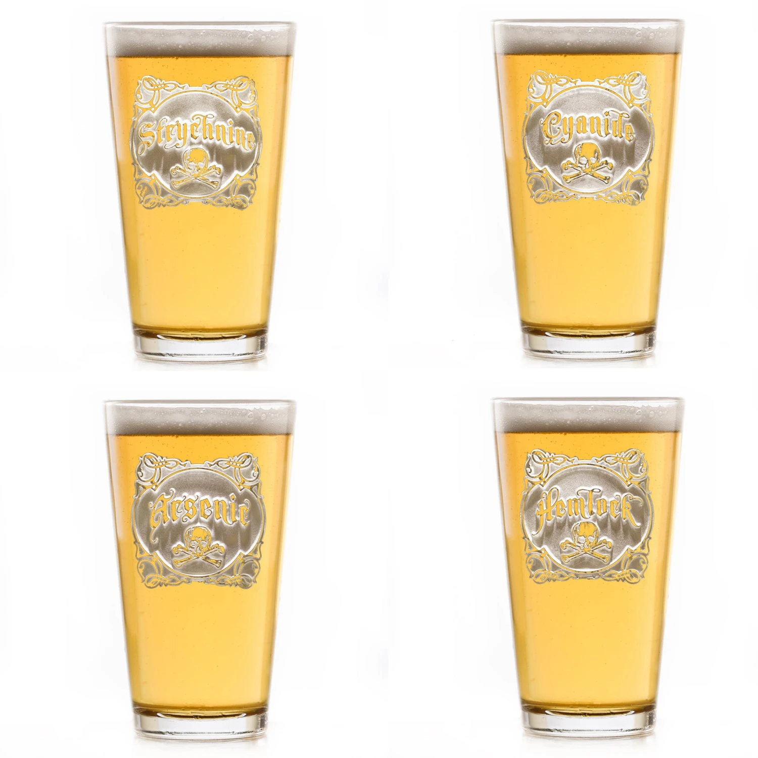 Name Your Poison Pint Glass Set of 4 for beer lovers is deeply sand-carved for a 3D finish. Pick Your Poison beer glass set is the perfect badass gift for the man or woman who has everything. Deeply engraved with a skull and crossbones design, our pub glasses have four different poisons etched deeply in the glass. A great humorous gift for the rockstar these four glasses sport poisons such as Strychnine, Hemlock, Cyanide, Arsenic.