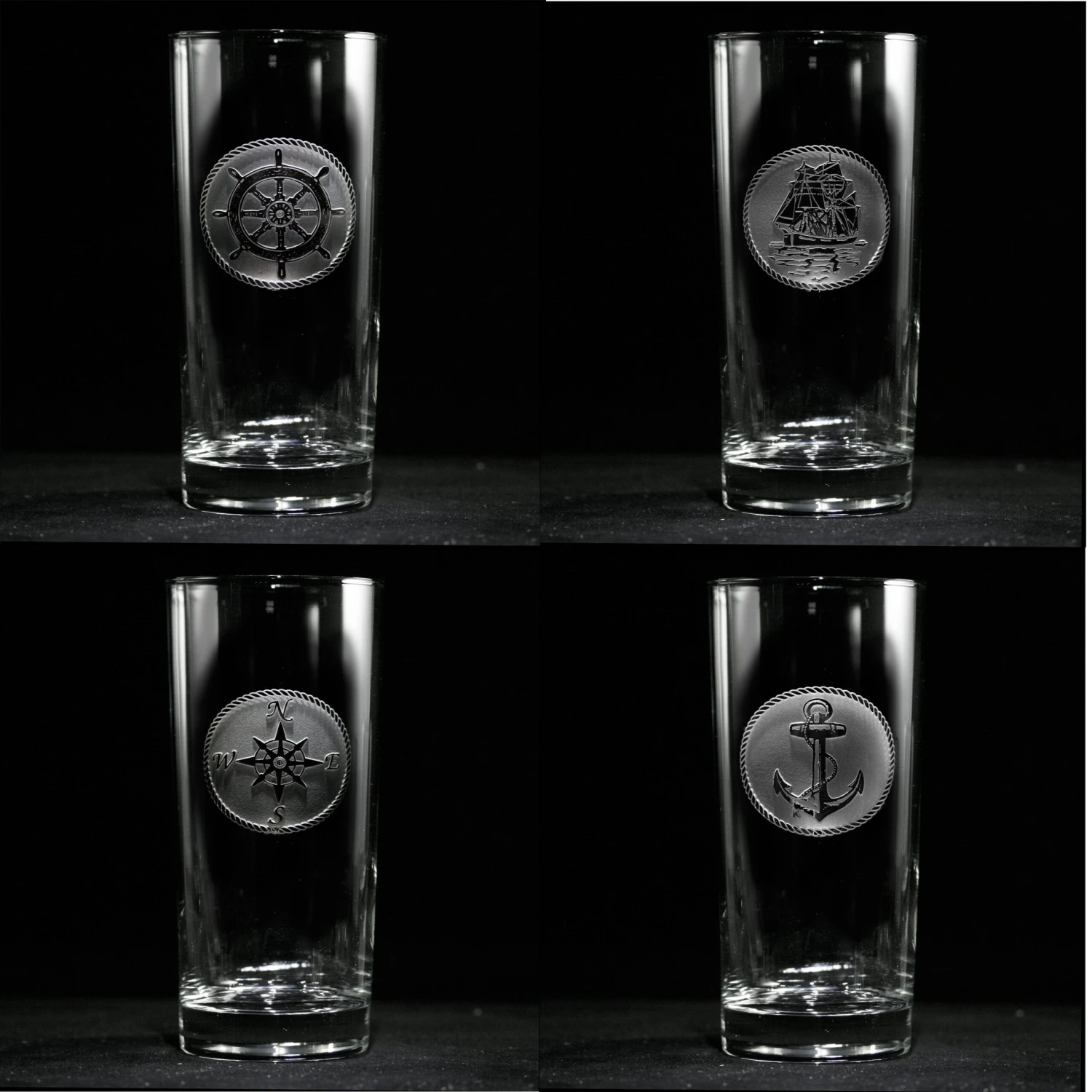 Engraved nautical theme highball cooler glass gift set for beach lovers, beach home or for your favorite boat loving sailor, captain, or fisherman. Deeply carved using our sand carving technique, each of our custom collins glasses is meticulously hand made to order making it the perfect gift for those seeking unique gift ideas for mixed drink cocktail lovers – men and women alike. A set of these etched, engraved high ball glasses for a nautical theme beach house or even someone who just wishes they were at the beach – will be the favorite gift at any special gift giving occasion. Dishwasher safe. Our 15 oz. cooler measures 6.25′ tall by 3′ wide. Made in the USA. Dishwasher safe.