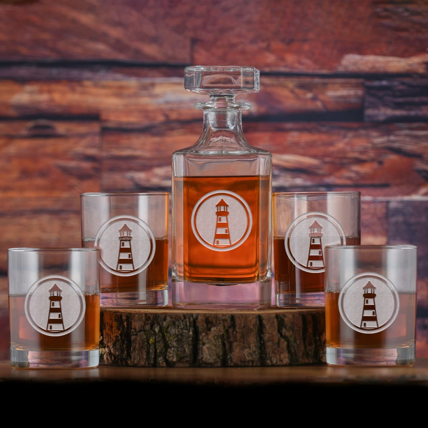 Nautical Lighthouse lovers will enjoy this ocean theme gift. Whether you are just starting your barware collection, or are ready for an elegant upgrade to your home wetbar glassware collection, our deep etched beach theme bourbon decanter 5 piece set may be just what you are looking for. Bringing together our deeply engraved and sculpted square style decanter and set of four whiskey glasses, this serving set is sure to elevate the style of any home. Each piece comes deeply sand-carved with a gorgeous and classic lighthouse design. This custom etched 5 piece decanter set is a timeless wedding gift, and is suitable for bourbon lovers on any occasion, men and women alike. Our master carvers will deeply sand carve the background design into the glass, leaving your lettering and design raised from the glass surface in a stunning 3D manner that is unmatched by simple engraving, etching or screenprinting techniques.