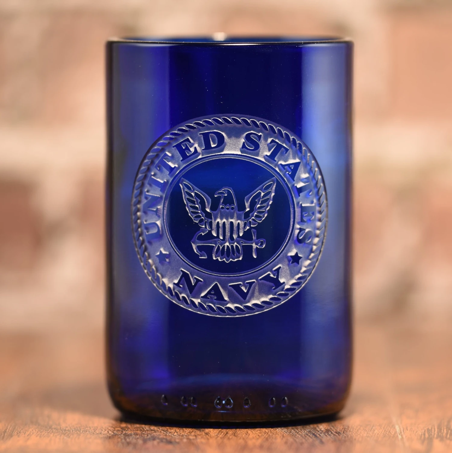 Engraved Navy tumbler glasses are a cool gift for your sailor. Military personnel would enjoy this repurposed wine bottle cocktail glass for retirement or officer promotion. Deeply carved using our sand carving technique, each whiskey, scotch, bourbon glass is meticulously custom made to order making it the perfect gift for those seeking unique gift ideas for whiskey lovers – men and women alike. A set of these etched recycled wine bottle glasses will be the favorite gift at any special gift giving occasion.