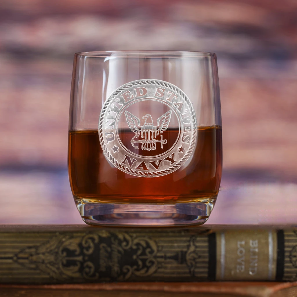Navy Weinland Whiskey Engraved Crystal Glass is a great Navy man or woman gift for military promotions, graduation, or retirement. Engraved military bourbon glasses are a classy gift for our service personnel. Deeply carved using our sand carving technique, each whiskey, scotch, bourbon glass is meticulously custom made to order making it the perfect gift for those seeking unique gift ideas for whiskey lovers – men and women alike. A set of these etched whiskey glasses will be the favorite gift at any special gift giving occasion.