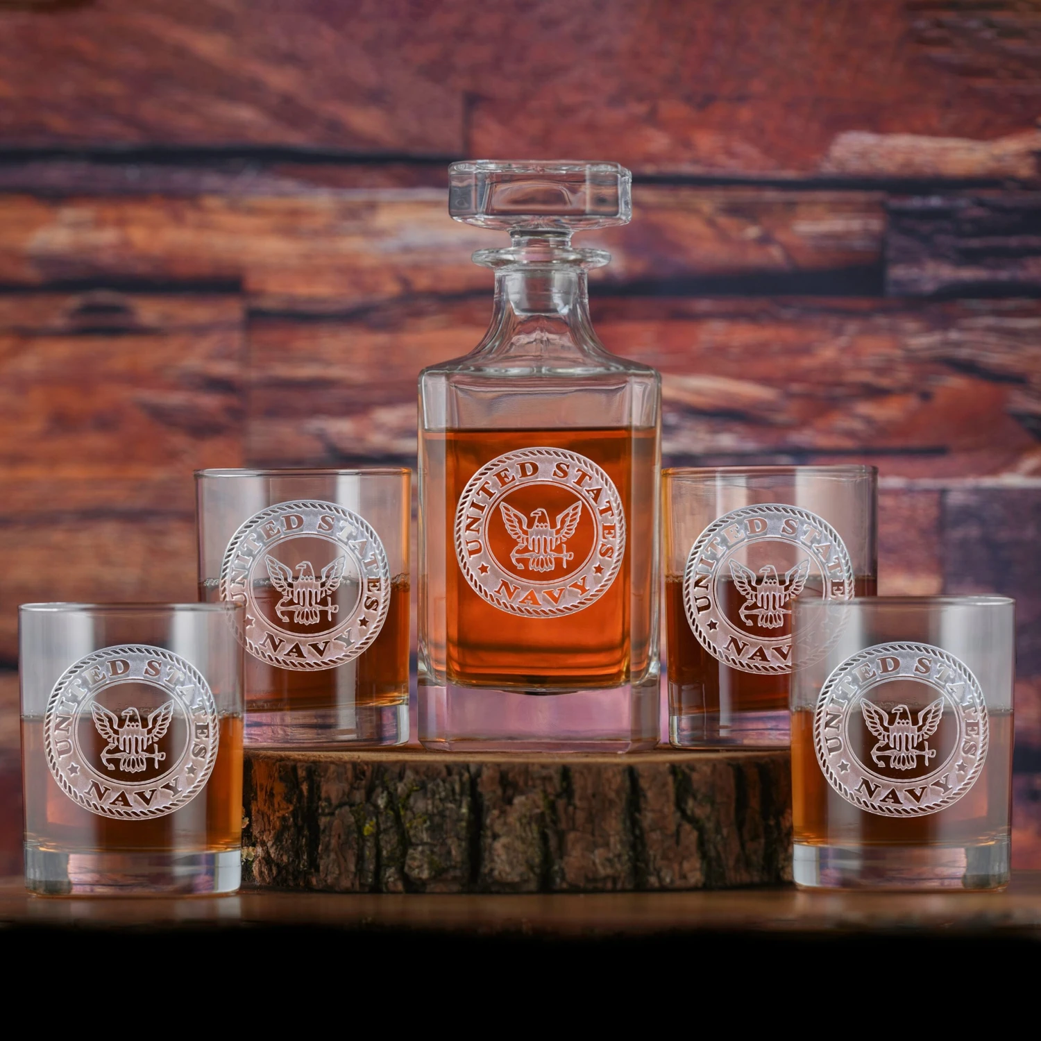 Navy whiskey decanter set with 4 rocks glasses. Whether you are just starting your barware collection, or are ready for an elegant upgrade to your home wetbar glassware collection, our personalized liquor decanter 5 piece set may be just what you are looking for. Bringing together our deeply engraved and sculpted square style decanter and set of four whiskey glasses, this serving set is sure to elevate the style of any home. Each piece comes deeply sand-carved with the Navy Seal in a gorgeous and classic design for military personnel. This personalized 5 piece decanter set is a timeless wedding gift, and is suitable for bourbon lovers on any occasion, men and women alike. Our master carvers will deeply sand carve the background design into the glass, leaving your lettering and design raised from the glass surface in a stunning 3D manner that is unmatched by simple engraving, etching or screenprinting techniques.