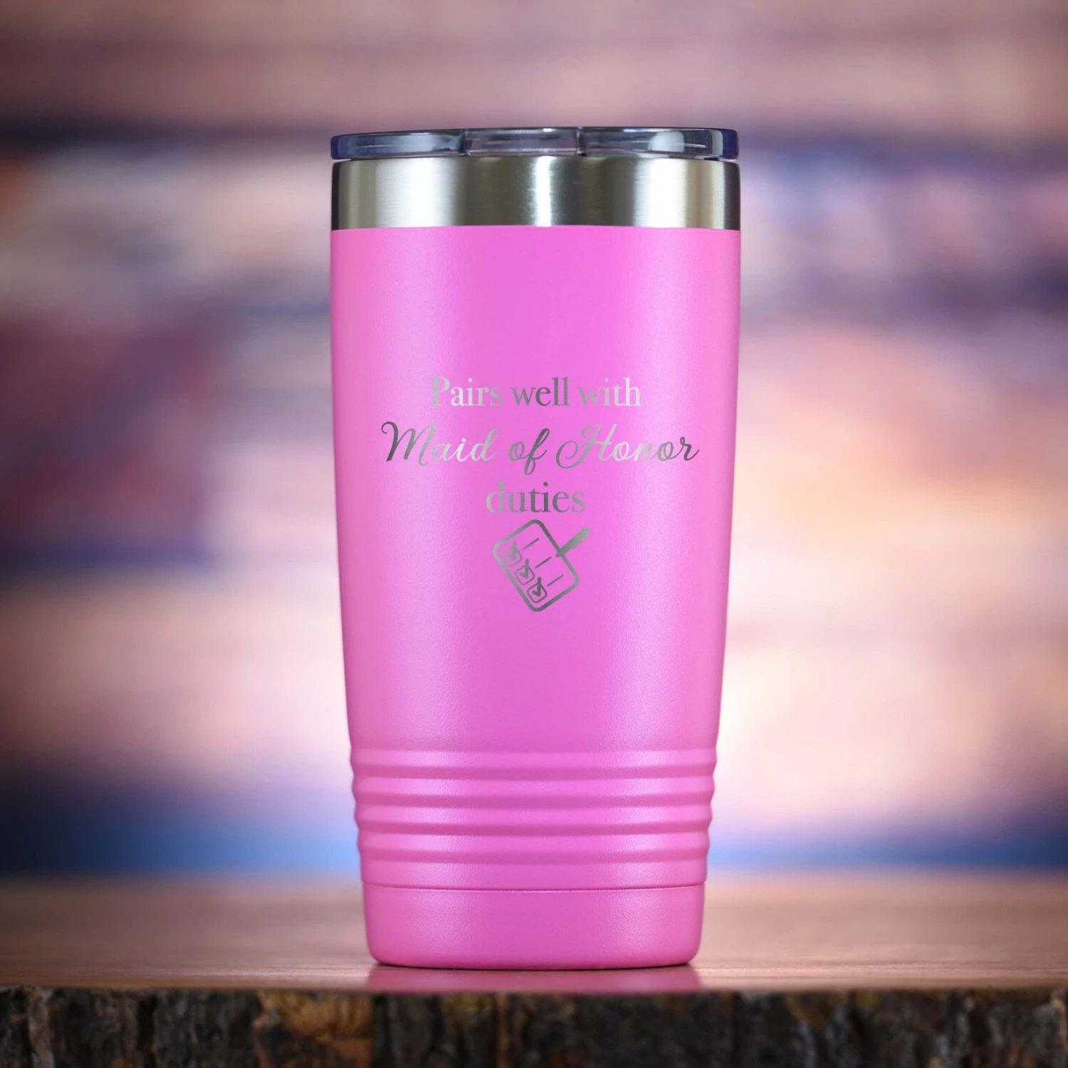 Pairs Well With Maid of Honor Duties Travel Tumbler Gift. Great bridal party or bachelorette party gift for your bridesmaids and maid of honor. Bridesmaid and Maid of Honor proposals are a popular way to ask your best friends to be part of your wedding and bridal party. Our travel tumbler is perfect for hot coffee or cold beverages on the run and has a narrower bottom to fit most cup holders in your car, jeep or truck. The opening in the lid is also big enough for a straw! We selected these Polar Camel 20 oz. ring neck vacuum insulated travel mugs for their high quality and durability. We laser etch our unique, funny and clever quotes and designs into the powder coated travel tumbler, which creates the design in a sleek stainless steel finish.