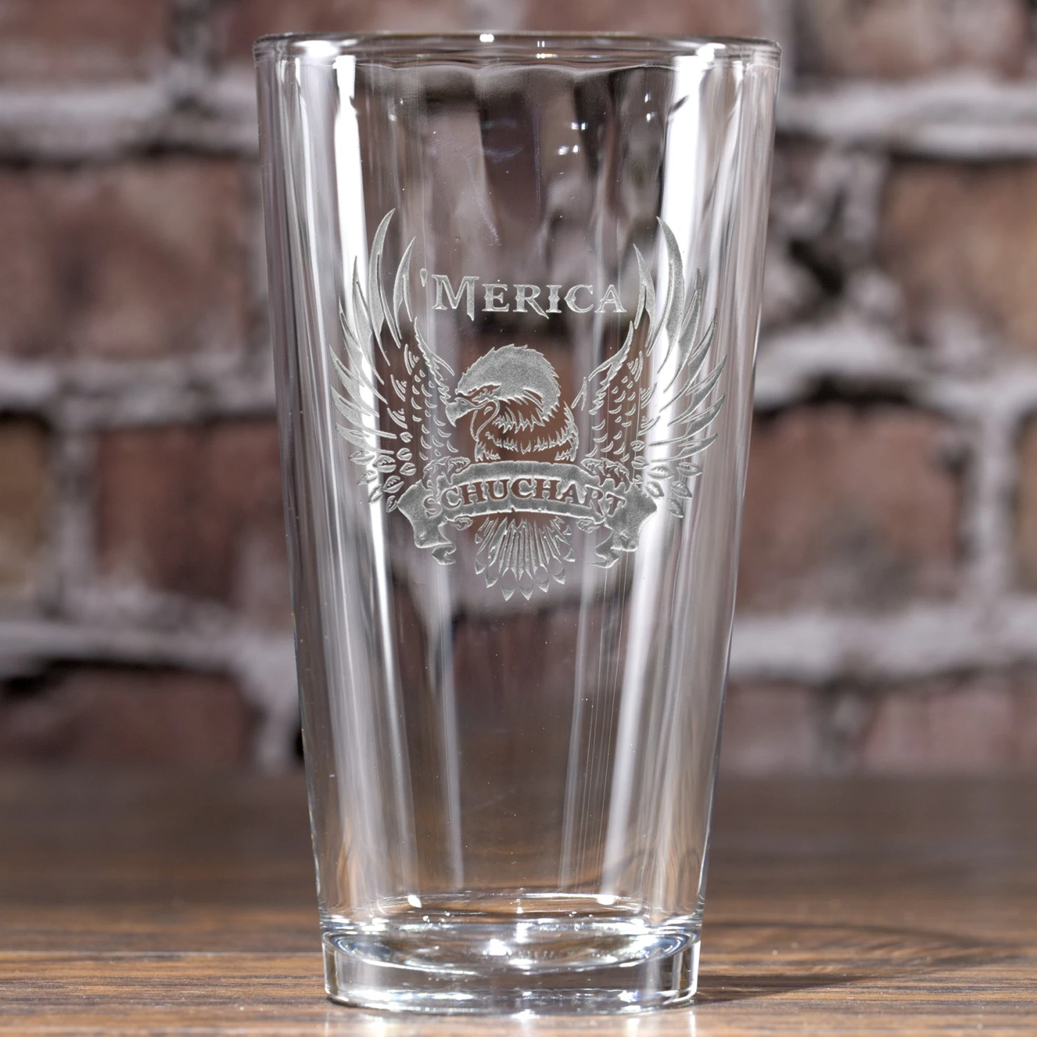 This engraved USA ‘Merica Bald Eagle Pint Beer Glass is a great Americana gift for our loyal freedom and liberty loving American patriot. Our badass barware line by Crystal Imagery is a classy gift for military personnel, police officers and other red-blooded Americans who proudly tout their loyalty to our flag and country. Deeply carved using our sand carving technique, each pub glass is meticulously custom made to order and personalized with your name in the banner making it the perfect gift for those seeking unique gift ideas for beer lovers – men and women alike. Dishwasher safe but we recommend hand washing.