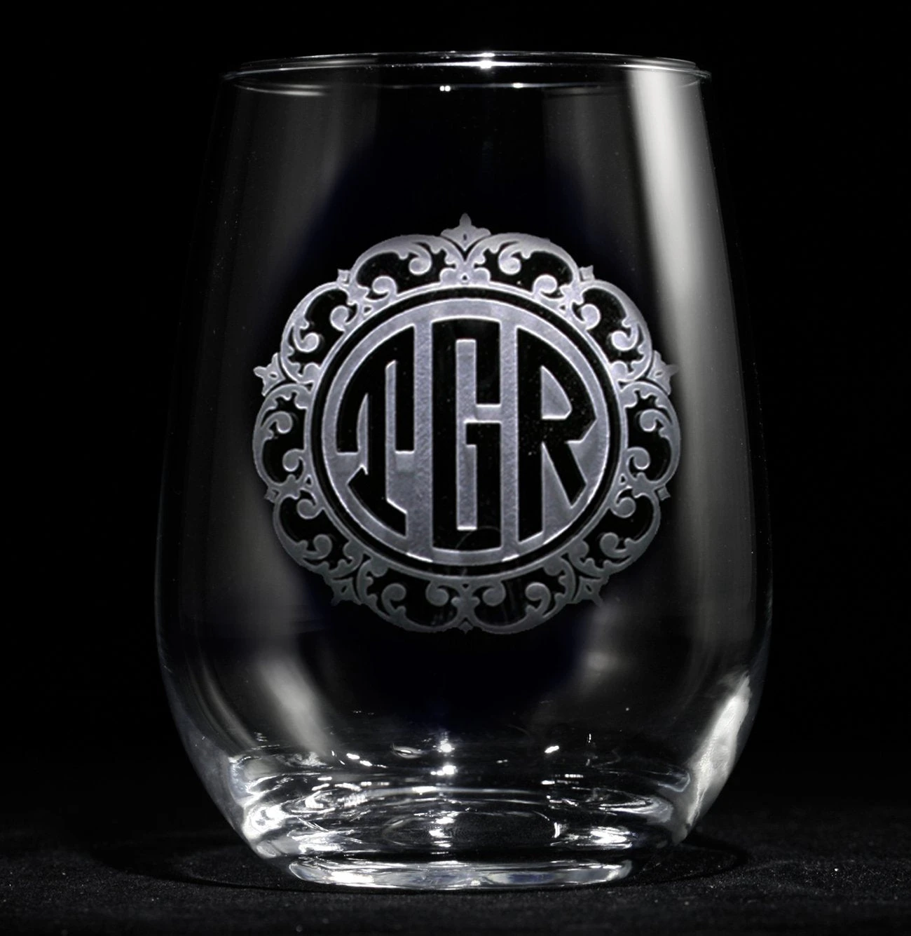 Customized Victorian style stemless wine glasses are a classy thoughtful gift for the wine lover. Deeply carved using our sand carving technique, each of our custom stemless wine glasses are meticulously custom made to order making them the perfect gift for those seeking unique gift ideas for wine lovers – men and women alike. At 4.5″ high our custom stemless wine glass holds 17 oz of your favorite wine in style. A custom engraved stemless wine glass will be the favorite gift at any special gift giving occasion. Personalized or monogrammed stemless wine glasses are a unique and special bridal shower gift, engagement gift, wedding gift or engagement gift. Also great gift idea for girlfriend or wife gifts, boyfriend or husband gifts, retirement gift or birthday for the classy man or woman who has everything. Dishwasher safe.
