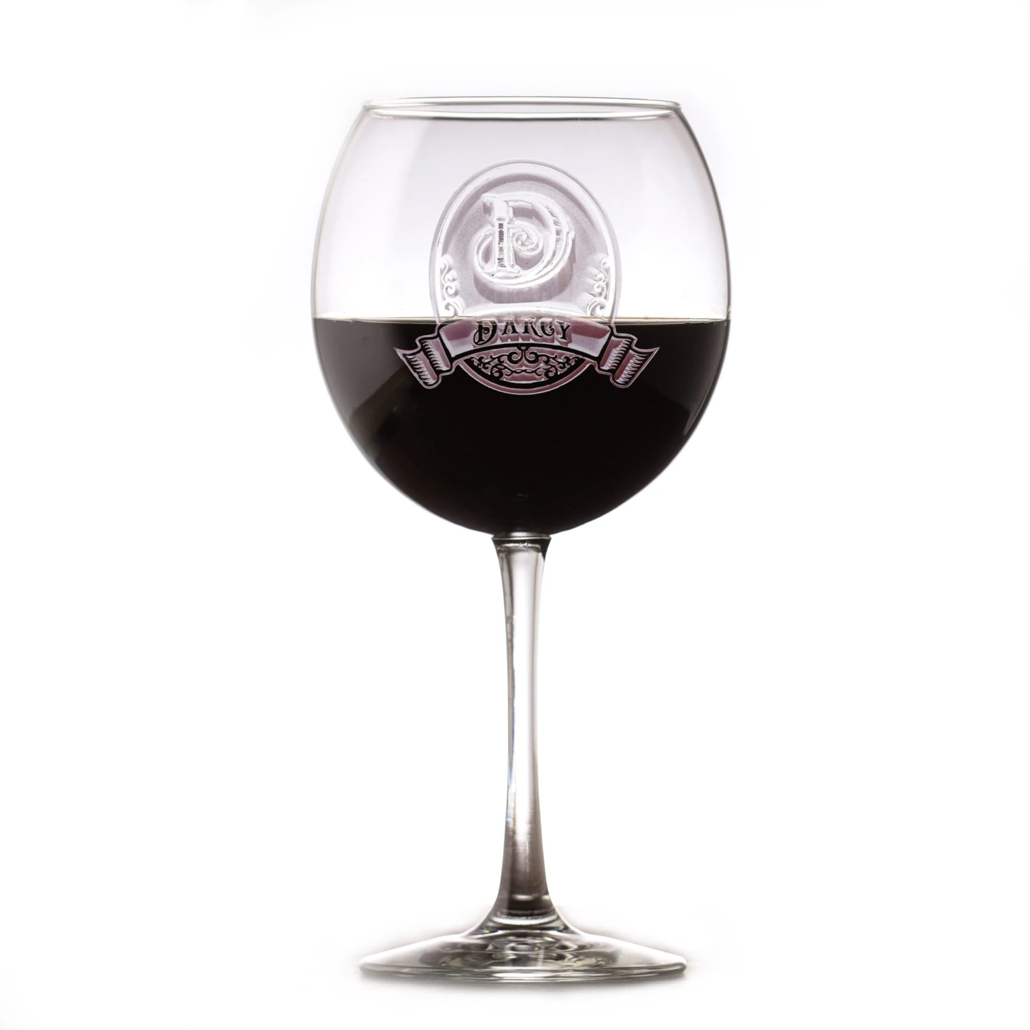 Personalized Monogram Red Wine Glass. A personalized monogram red wine glass, custom engraved by Crystal Imagery is a truly classy gift for weddings, anniversaries or any special gift occasion for the wine enthusiast. Our master glass carvers will deeply etch the beautiful scrolling background panel and name banner of this popular design, leaving your name and initial monogram untouched and raised from the red wine stemware surface in a breath-taking three dimensional manner. Our stemware is truly unique and will bring many exclamations of “wow” when your guests are handed one at your next special gathering. No home bar cart or wine cellar is complete without a set of personalized red wine glasses in the collection.