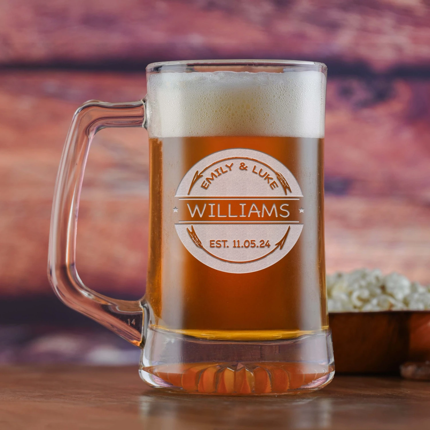 Our engraved Rustic Arrows Beer Mug makes a cool wedding gift idea, anniversary gift, housewarming gift or a gift for any special occasion. Personalized this custom beer mug with the couples’ names across the top banner, their last name in the center banner and their date of marriage or union across the bottom. Featuring a rustic set of vintage arrows, this design is right on trend with today’s modern family eclectic style.