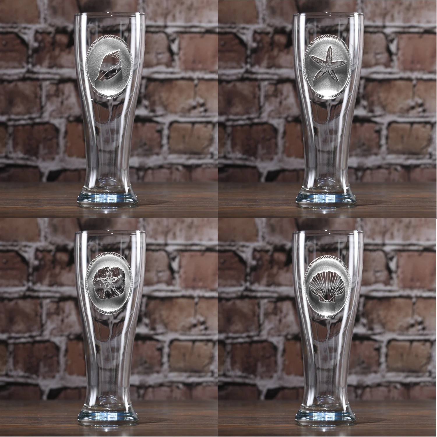 Seashell Beach Pilsner Glasses. Seashell motif beach house pilsner glasses are what every coastal home needs to complete their glassware set and entertain their guests in style. Elegant and classic, our seashell pilsner beer glasses feature four different seashells including a conch shell, a scallop shell, sand dollar and a starfish. Anyone who loves beach home decor will want a set of these beauties to complete their home bar, to use in the kitchen or to complete a basement bar or man cave.